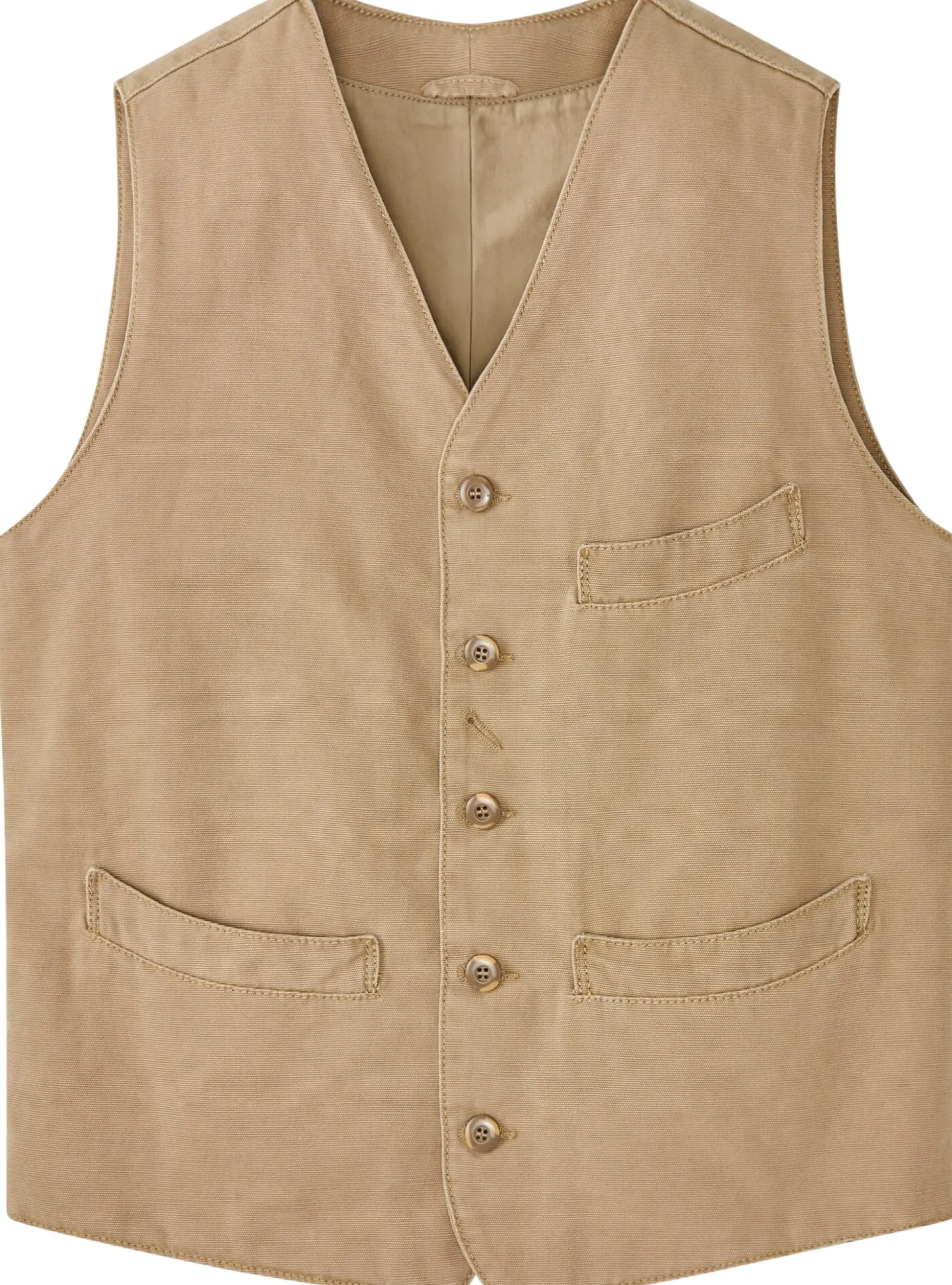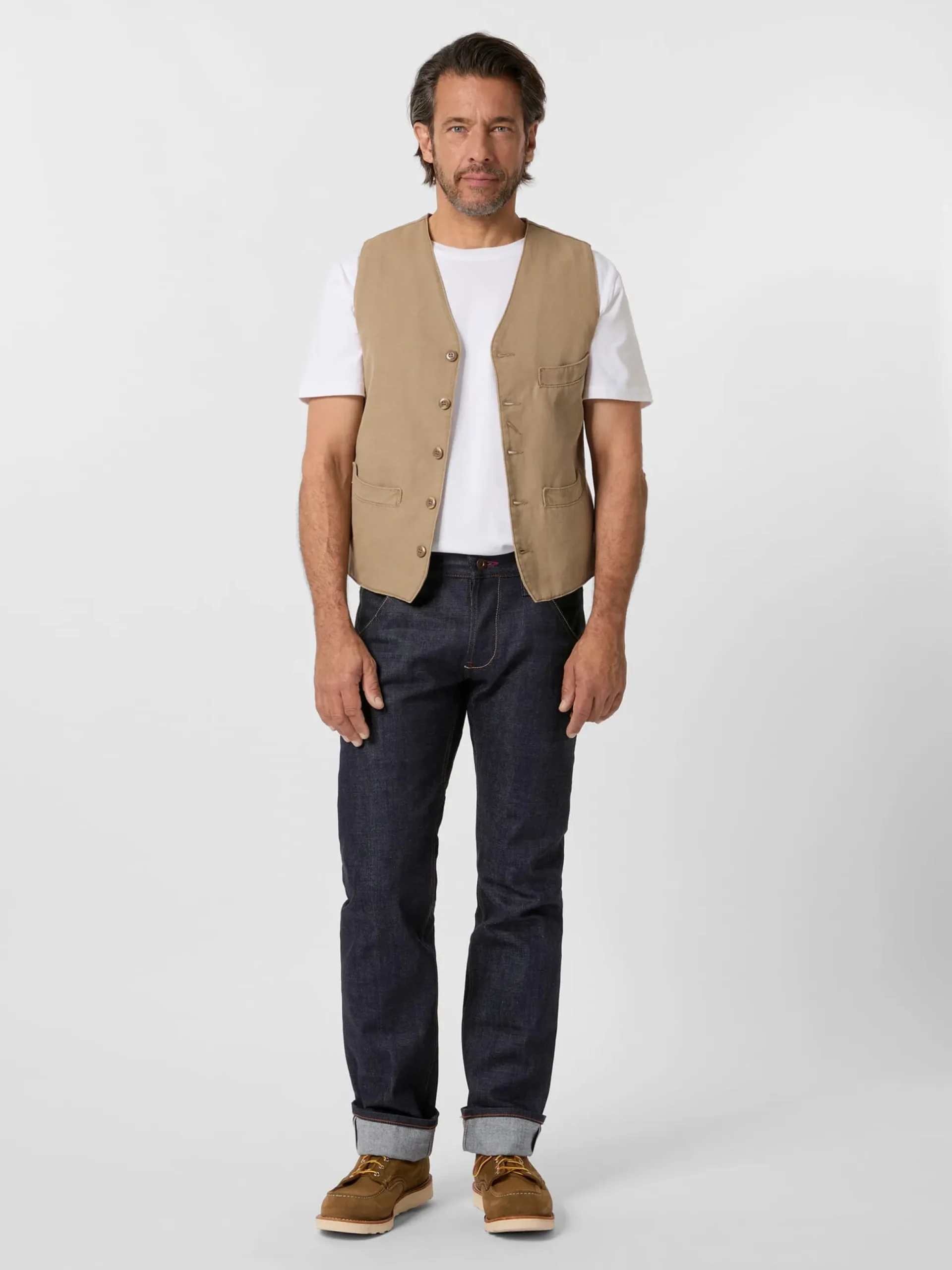 Einst schützten Westen wie diese das Oberhemd bei der Arbeit vor Schmutz und Beschädigung. Pike Brothers fertigt die Neuauflage einer solchen kragenlosen Weste aus einem markanten Baumwollcanvas. Front und Rücken sind aus dem Oberstoff gearbeitet, innen ist die Weste mit einem leichten Baumwolltuch gefüttert. Drei eingesetzte Taschen bieten Platz für Kleinteile des täglichen Bedarfs, ein aufgesetzter Taillenriegel aus dem Oberstoff erlaubt eine moderate Weitenanpassung mittels Metallschließe. Ein optisches Detail ist das schräg eingesetzte Zierknopfloch zwischen dem zweiten und dritten Knopf.