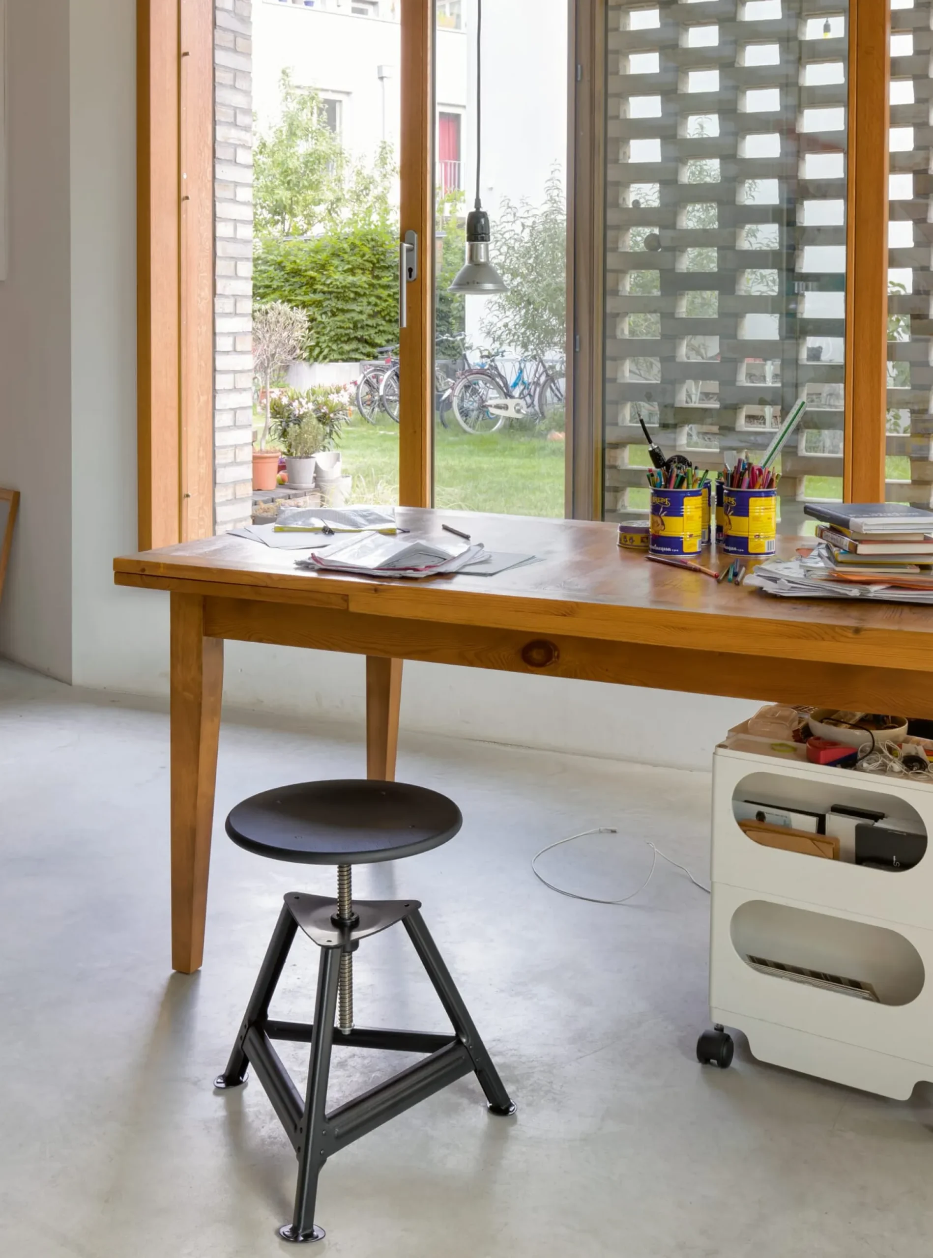 Der Industrie-Arbeitshocker schlechthin: Die Konstruktion dieses Sitzmöbels existiert seit den 20er-Jahren des vergangenen Jahrhunderts und gilt auch heute noch als eines der meist genutzten Arbeitsmöbel – zumindest zu Zeiten verbreiteter manufaktureller Fertigung in der Industrieproduktion. Nicht etwa ein nostalgischer Hang lässt uns dieses Möbel wieder ins Programm aufnehmen. Was uns reizt, ist sein Purismus, die klare und unverfälschte Konstruktion. Seit den 1960er-Jahren wird er unverändert und in bester Industriequalität in einer schwäbischen Fabrikation für Arbeitsmöbel produziert. Die Hocker besitzen stabile Gummigleiter an ihren Füßen, der leicht gemuldete Sitz ist mehrschichtig aufgebaut, die sichtbare Schicht besteht aus Eiche und ist naturbelassen. Die schnelle Patinierung – wenn sie nicht gewünscht ist – vermeidet man mit Ölen oder Wachsen der Oberfläche.