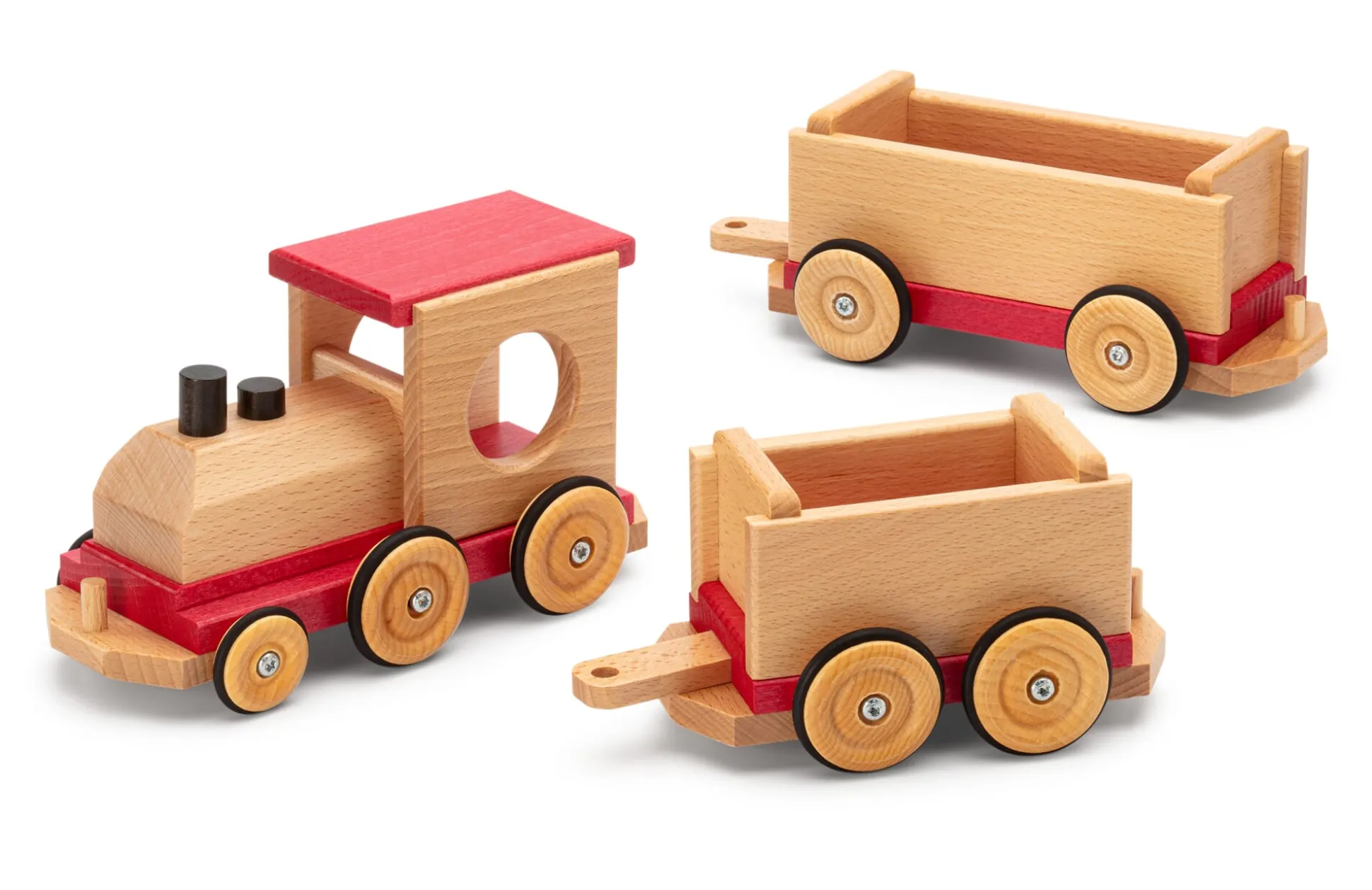 Eine Lokomotive und zwei Waggons aus Buchenholz, teilweise lackiert. Bereifung aus Silikon. Lokomotive Höhe 11 cm, Breite 9,5 cm, Länge 19,5 cm. Waggons Höhe 8 cm, Breite 9,5 cm, kurzer Waggon Länge 17,5 cm, langer Waggon Länge 22,5 cm. Gesamtlänge zusammengesteckt 55 cm. Gesamtgewicht 1,1 kg.