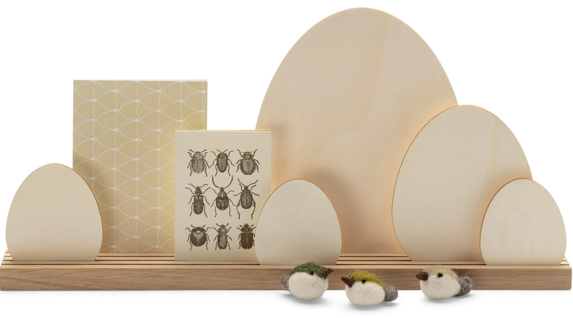 Nicht nur untereinander lassen sich die Motive zu unterschiedlichsten Szenerien kombinieren, ebenso schön wirken sie im form- und farbenfrohen Zusammenspiel mit Karten und Briefen, Origami- oder Filzobjekten, mit Blüten, Blättern und zugeschnittenen Zweigen. Lassen Sie Ihrer Phantasie einfach den freien Lauf, den Ihnen Motive und Leiste gewähren. Und wenn Sie Familie und Freundeskreis mitsamt Nachwuchs in die kreative Gestaltung einbeziehen möchten, so sind die Holz-Motive eine wunderbare Grundlage für einen Abend, an dem Sie gemeinsam rund um und auf die Motive malen, kleben und basteln.
