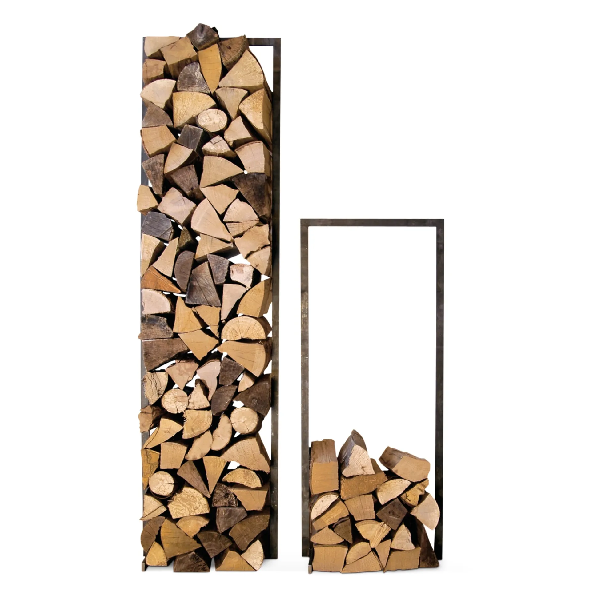 Ein Rahmen aus rohem verzundertem Stahl gibt dem Brennholz seitlichen Halt. In zwei verschiedenen Höhen gestapelt, steht das Holz sicher und ist auch als Raumteiler einsetzbar.