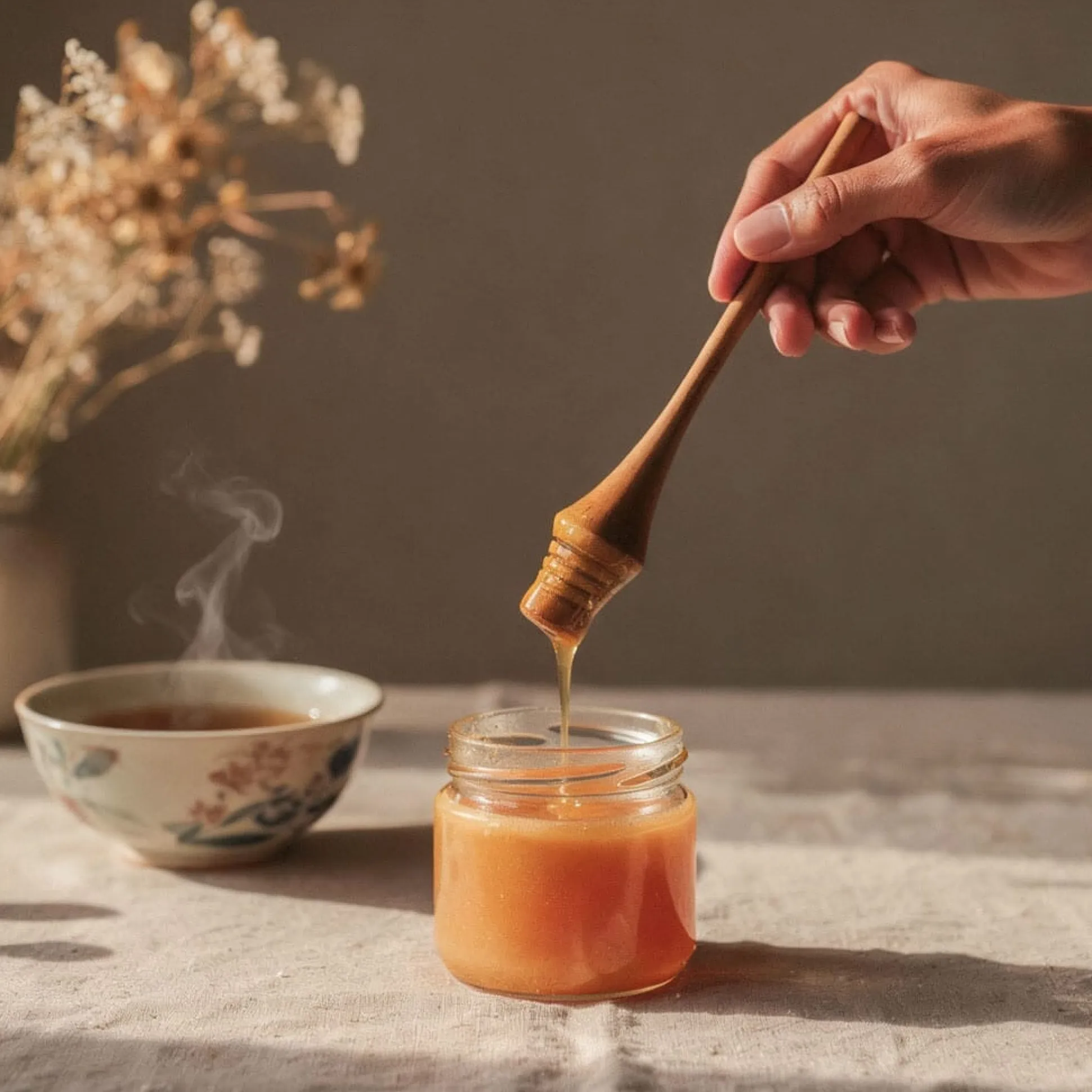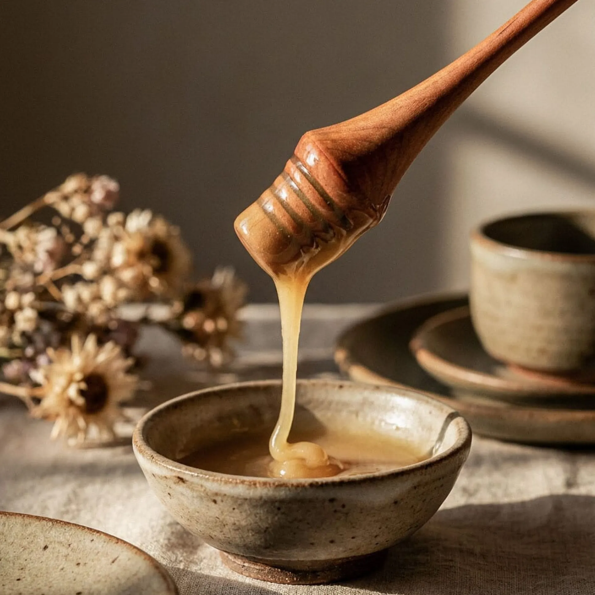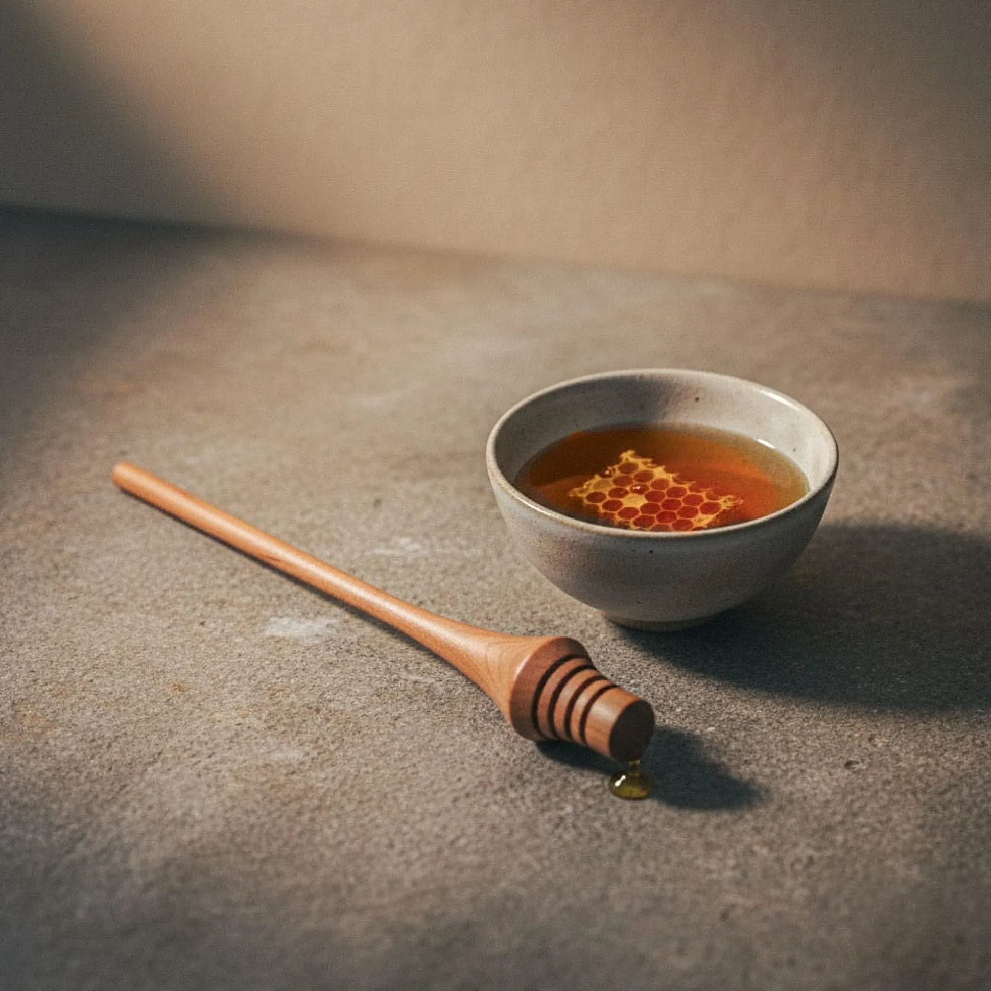 Der Honiglöffel zählt zu den sinnreichen Erfindungen am Frühstückstisch. Als Dosierhilfe gedacht, erfüllt er seine Aufgabe aufs Beste dank der rund um das Funktionsteil eingearbeiteten Rillen oder Einkerbungen, die flüssige Honige in eine bestimmte Richtung lenken – nämlich auf Ihr Frühstücksbrötchen (und nicht im weiten Umkreis daneben auf die Tischdecke). Im Falle unseres Honiglöffels aus Elsbeerenholz werden diese Einkerbungen in das Material gefräst. Geschmeidig glatt geschliffen und geölt, bringen die Oberflächen die natürliche Maserung des Holzes geradezu zum Leuchten. Ein Vorteil bei der zuckerhaltig-klebrigen Flüssigkeit, die es zu dosieren gilt: Das harte Holz der Elsbeere verfügt über eine so feinporige, dichte Textur, dass es sich stets einfach säubern lässt.