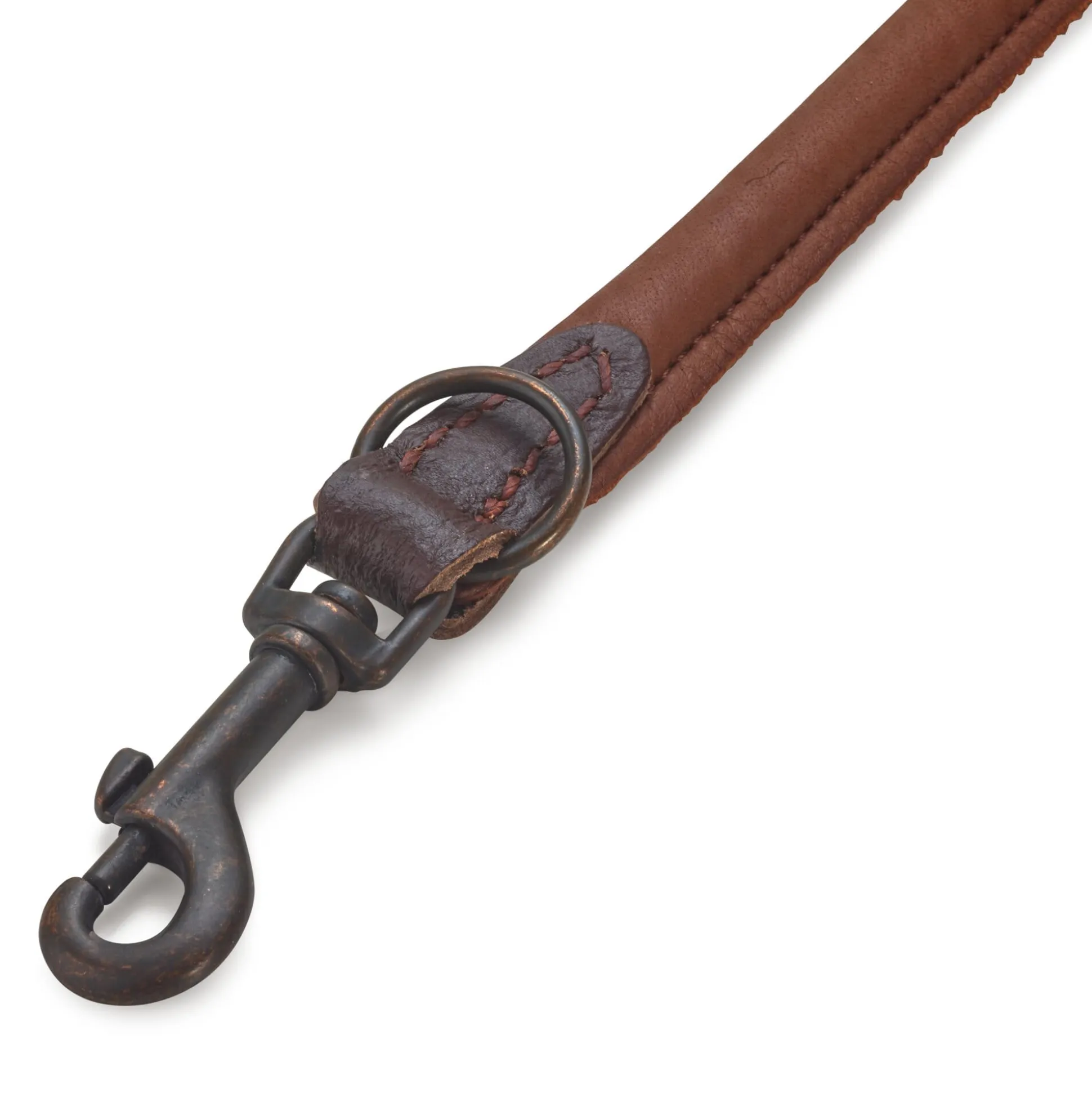 Elchleder (Stärke 2–2,2 mm), vegetabil gegerbt. Breite 1,5 cm. Farbe Braun. Einfassleder vegetabil gegerbtes Rindleder. Durchzugsweicherkette bzw. Karabiner und Ringe sind aus verkupfert patiniertem Stahl.