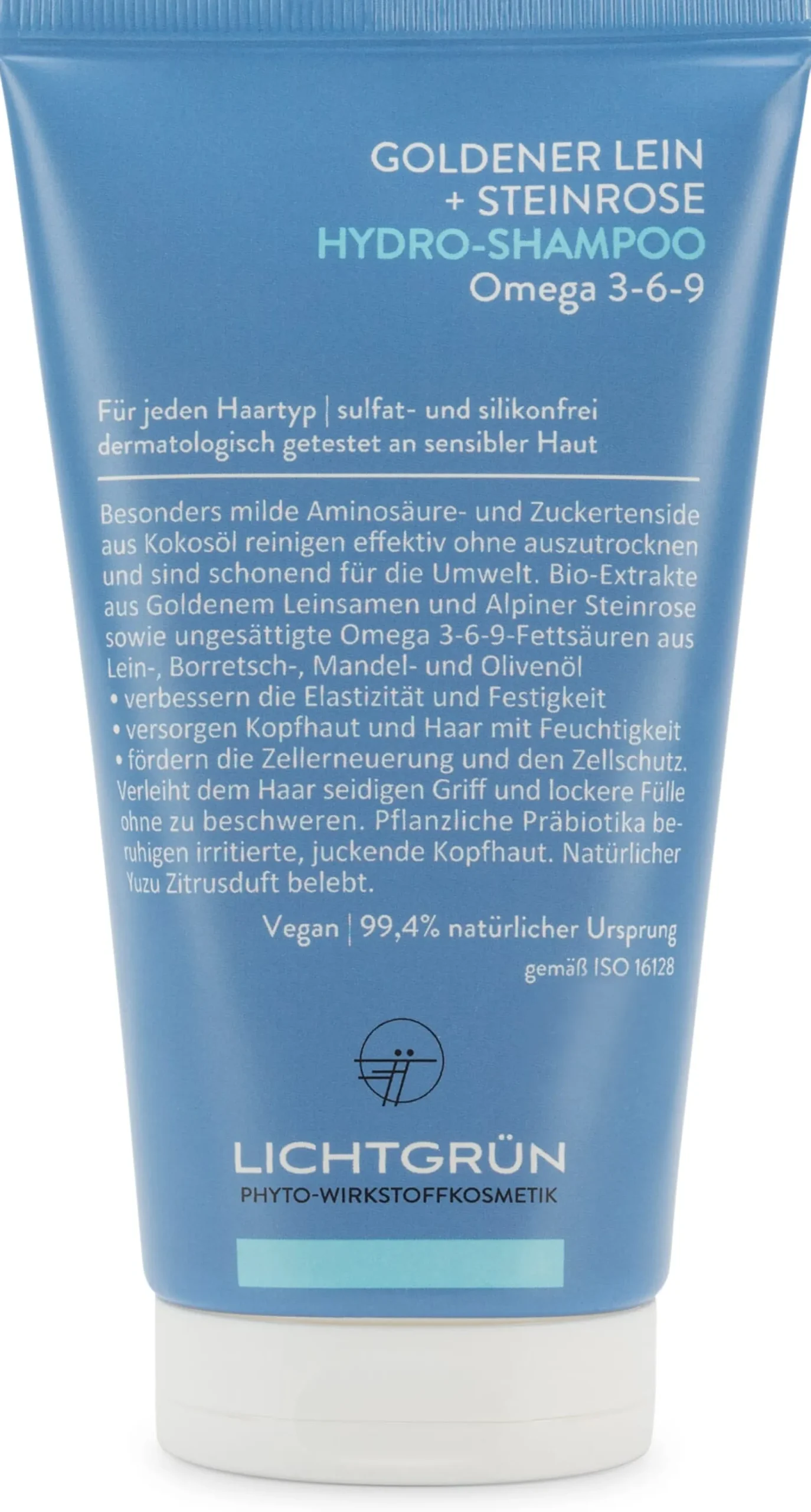 Das Hydro-Shampoo reinigt sanft, aber effektiv mit besonders milden Aminosäure- und Zuckertensiden aus Kokosöl, ohne das Haar auszutrocknen. Hochkonzentrierte Omega-3-6-9-Fettsäuren aus Lein-, Borretsch-, Mandel- und Olivenöl sowie die Extrakte aus Goldenem Leinsamen und Alpiner Steinrose verbessern die Elastizität und Festigkeit des Haars. Sie versorgen Kopfhaut und Haar mit Feuchtigkeit und unterstützen die Zellerneuerung und den Zellschutz. Pflanzliche Präbiotika können helfen, die Schutzbarriere der Kopfhaut zu stärken und zu stabilisieren.