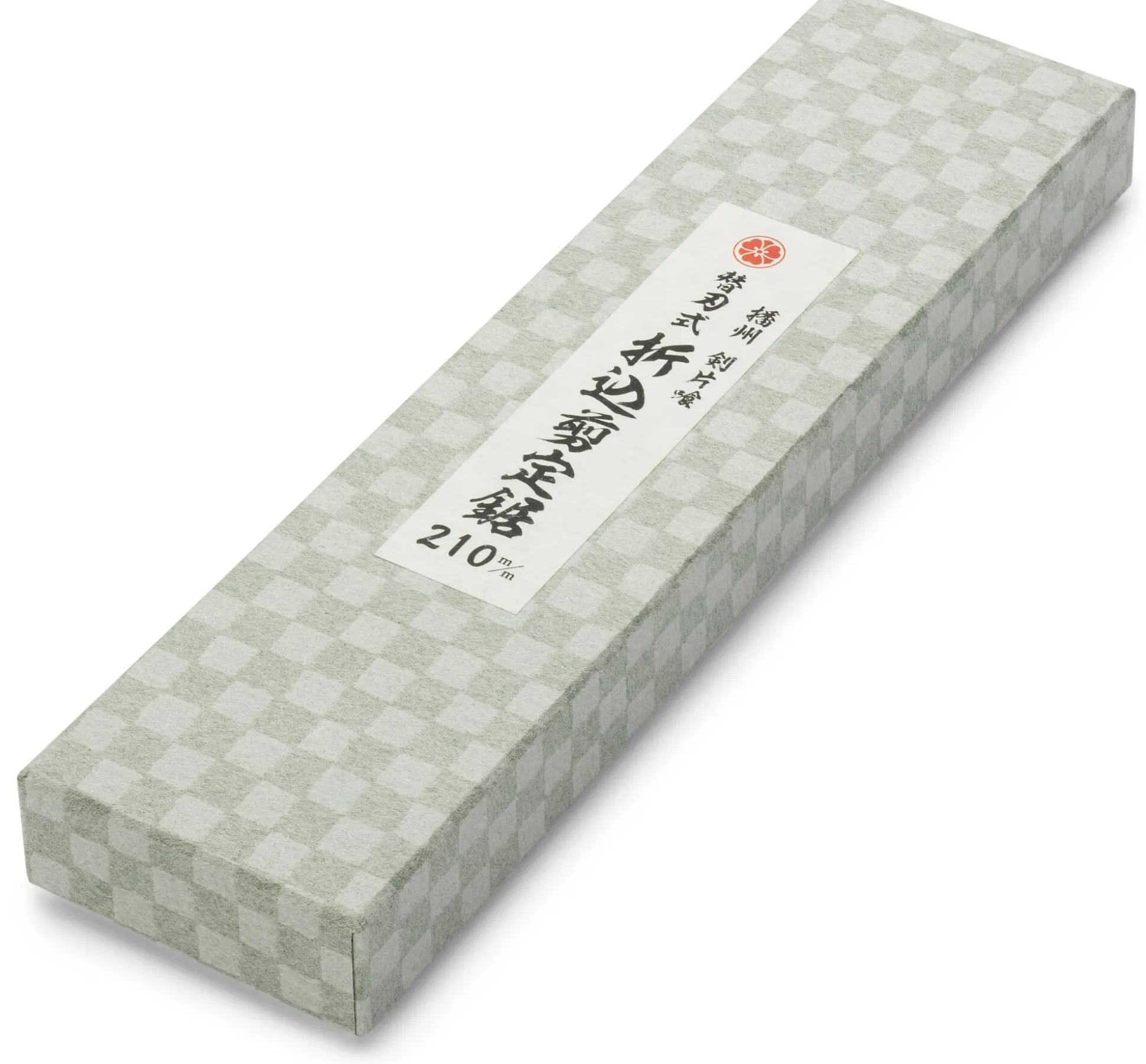 Sägeblatt aus Werkzeugstahl. Griff Pappelholz unbehandelt. Gefertigt in Japan. Blattlänge 21 cm, Gesamtlänge 49 cm. Zusammengeklappt Länge 26,5 cm, Breite 7,5 cm. Gewicht 148 g. In Pergamentpapier gehüllt und verpackt in einer Schmuckschachtel aus bedrucktem Karton.