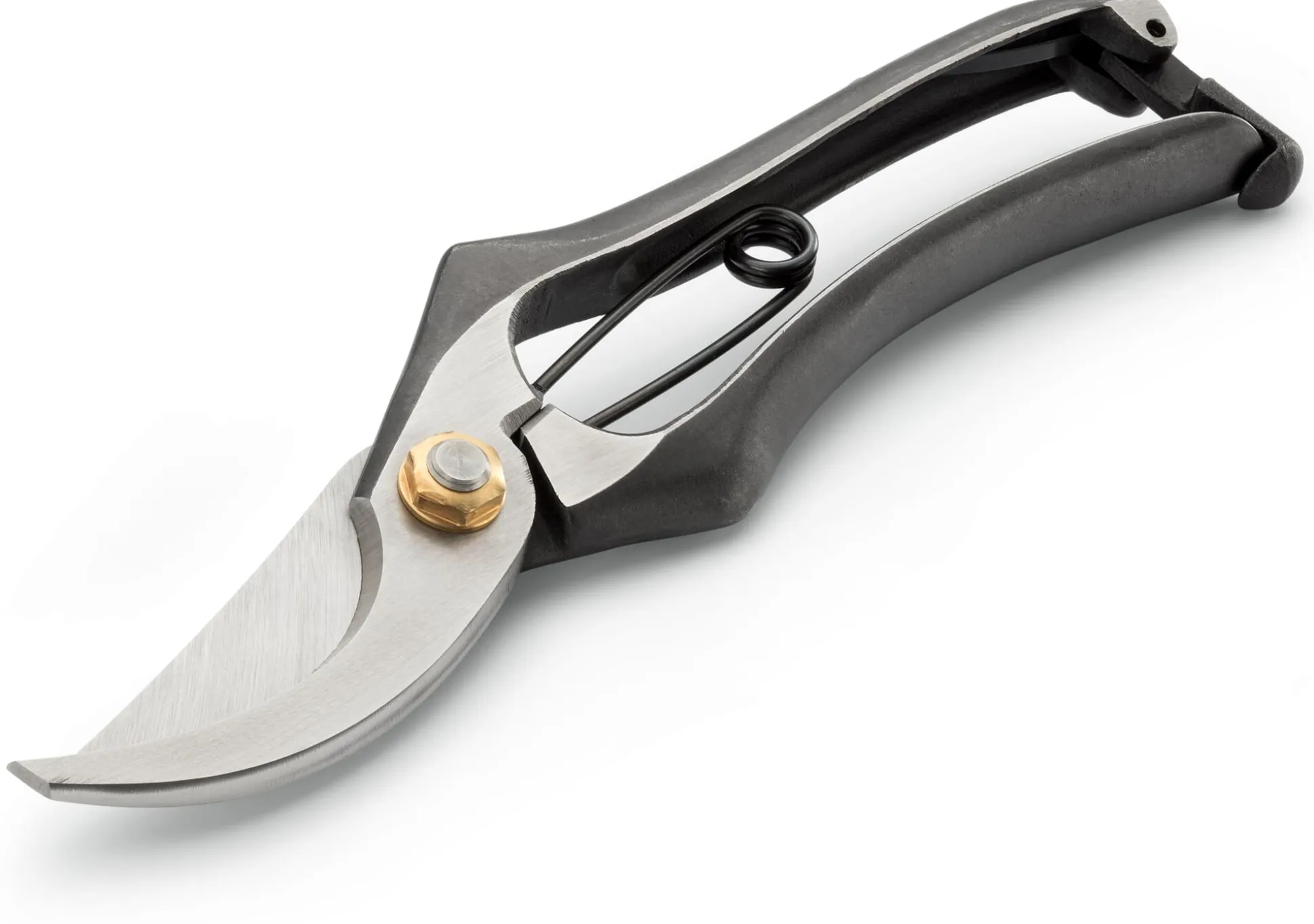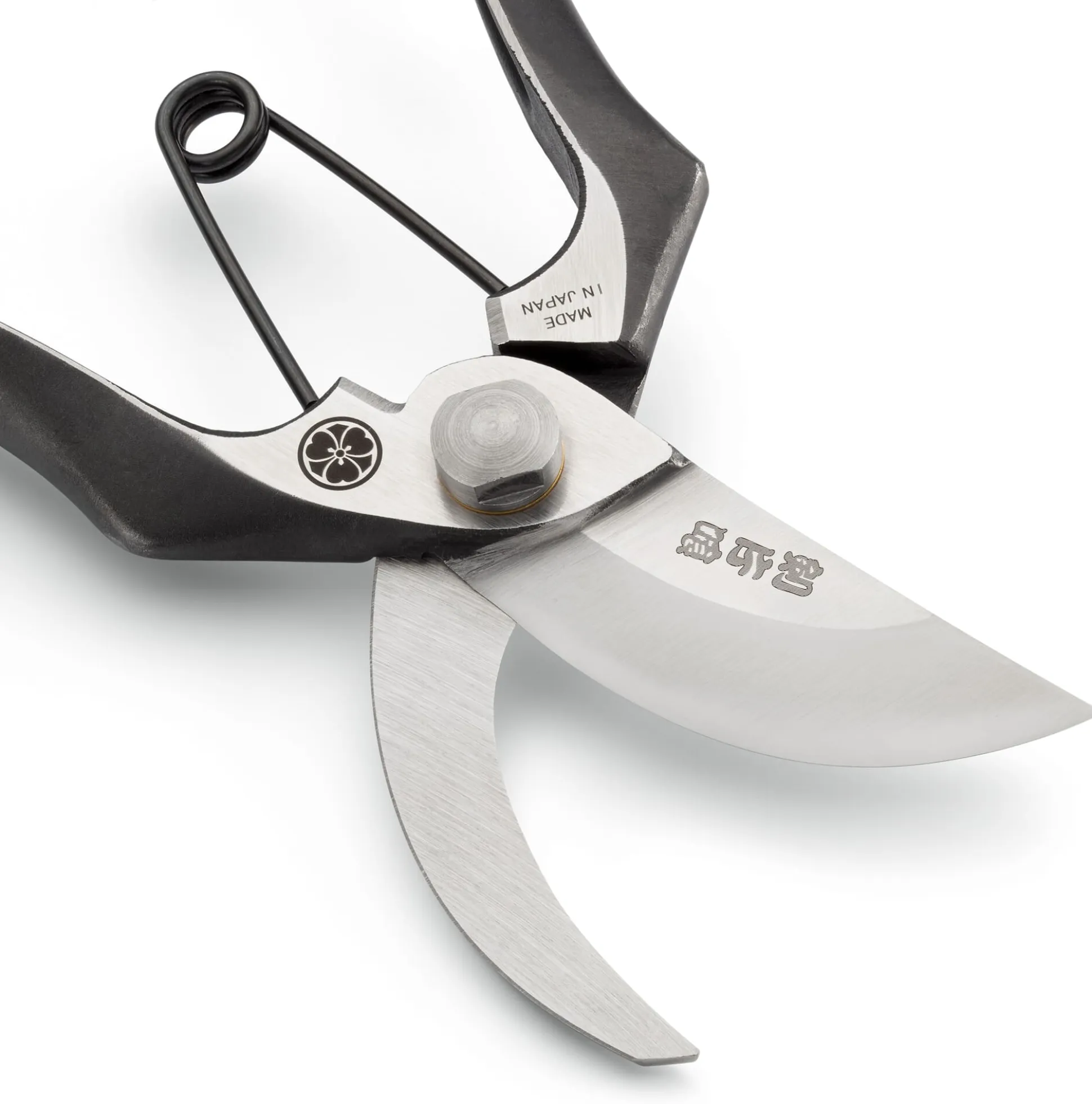 Was für japanische Messer gilt, ist auch japanischen Scheren eigen: Sie sind überaus scharf. Dieses Modell verfügt über geschmiedete Klingen aus Kohlenstoffstahl und ist zudem – wie Sie den eingestanzten Schriftzeichen unschwer entnehmen können – von Hand gemacht, und zwar vom Schmieden über das Schleifen und Polieren bis hin zur Endmontage (ganz so ausführlich steht es aber nicht da). Schlicht und der Handanatomie entsprechend geformt, aus Vollmetall und mit einer starken Drehfeder versehen, ist die Schere mit ihren gehärteten Blättern für den Schnitt von Stauden, Rosen und Gehölzen (bis 2,5 cm Astdurchmesser) geeignet.
