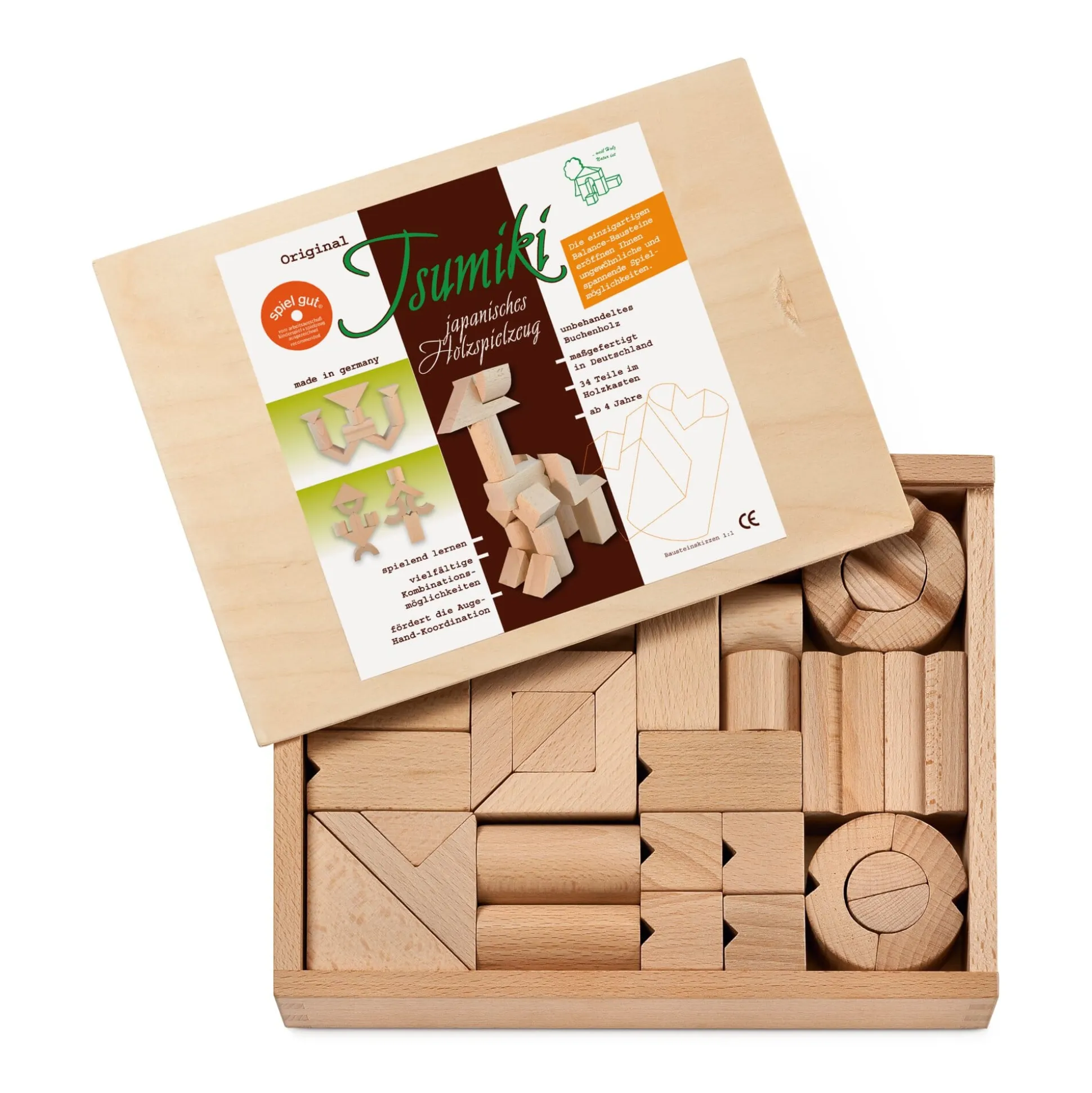 34 Bausteine aus unbehandeltem Buchenholz. In einer Holzkiste mit Schiebedeckel. Hergestellt in Deutschland. Länge 25,5 cm, Breite 19,5 cm, Höhe 4,5 cm. Gewicht 1,1 kg. Mit einer Anleitung, die viele Aufbaubeispiele enthält.