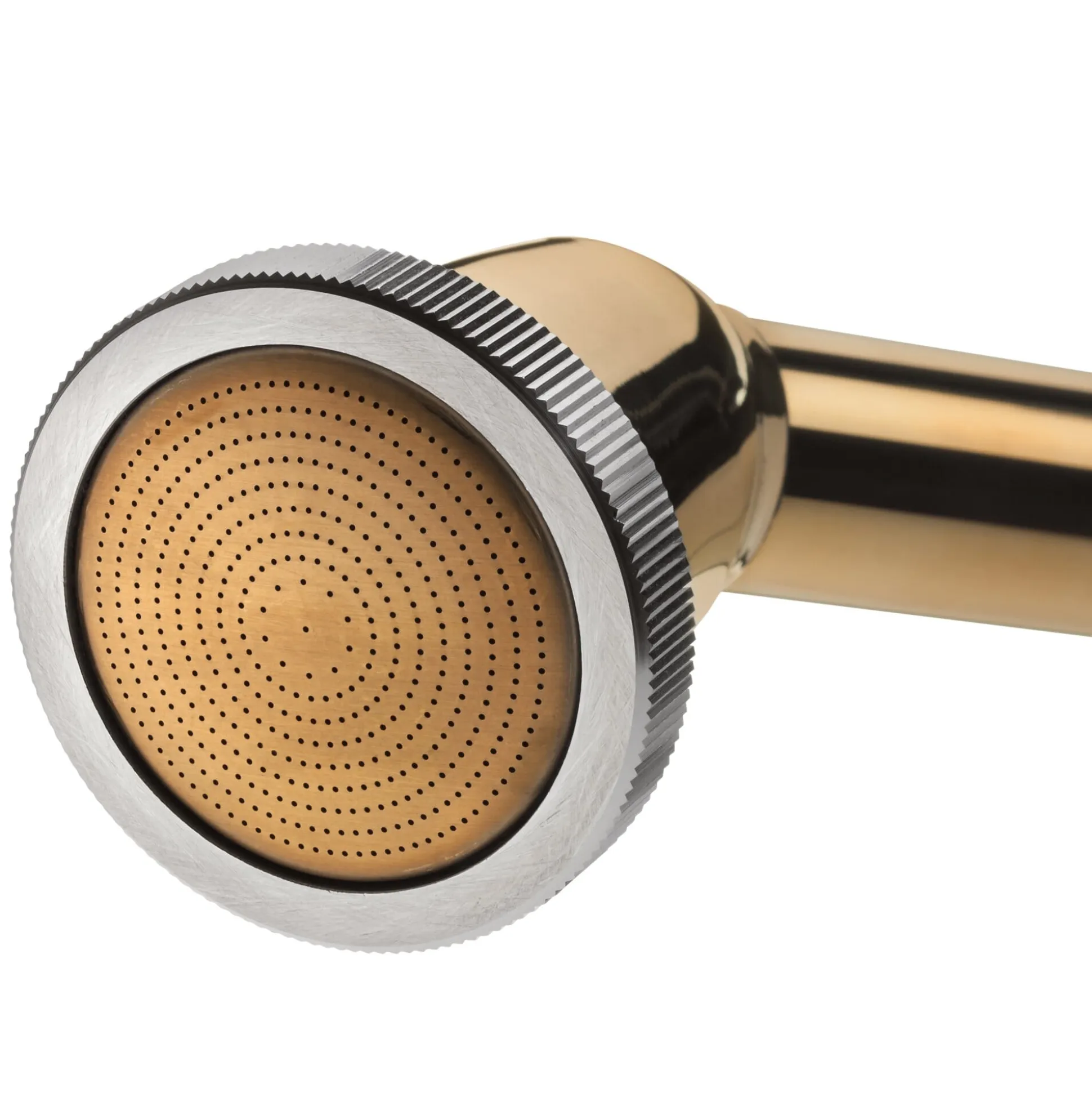 Gießrohr, Brausekopf und Anschlussstecker Messing, Hebel aus Stahl, Rändelmutter Aluminium. Hergestellt in Japan. Länge 43 cm, Brausekopf Ø 4,5 cm. Gewicht 300 g.