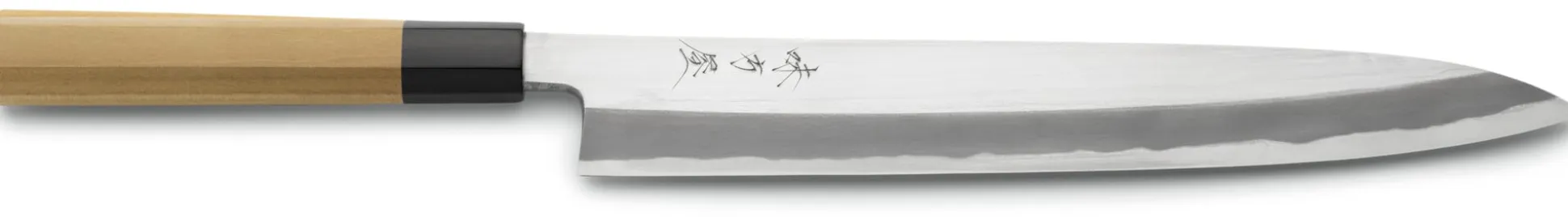 Das Schlanke: ein Messer, das eigens zum Filetieren gedacht ist. Daraufhin ist seine schmale Klingenform optimiert. Achten Sie auf die Länge der Klinge unseres Sujihiki-Messers: Sie misst ganze 27 cm. Mühelos gleitet sie durch (rohen) Fisch, ebenso durch Fleisch, und ermöglicht präzises, sauberes Arbeiten, ohne die Zuschnitte zu zerfasern. Verwenden Sie dieses Messer auch zum Tranchieren oder Zerteilen von Braten sowie zum hauchdünnen Aufschneiden von Wurst und Schinken.