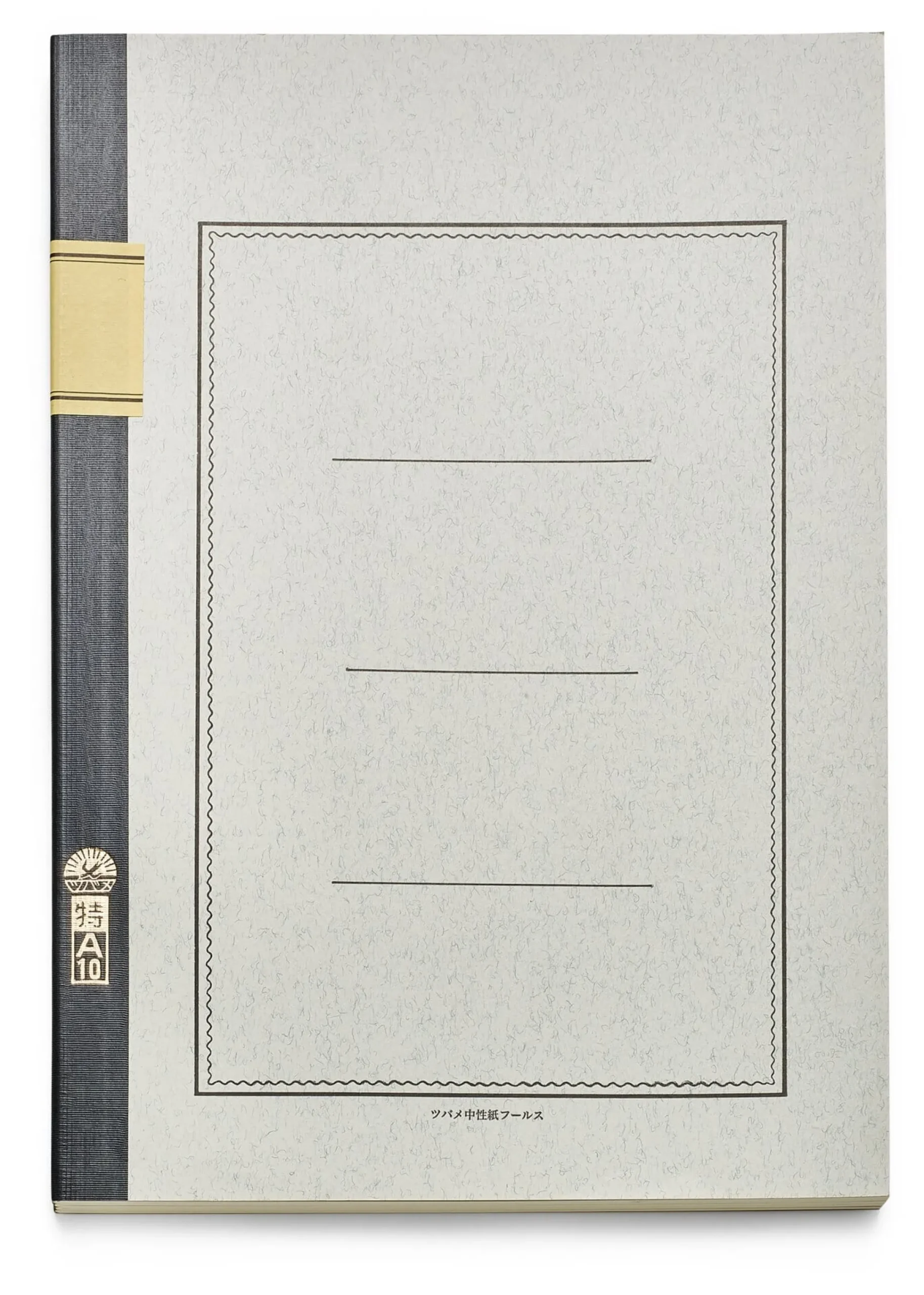 200 Seiten starkes Notizheft im A4-Format, mit 30,5 × 21 cm jedoch 8 mm höher als DIN A4. Es besteht aus 4 fadengehefteten Heften, die mittels des Kartoneinbandes und des Fälzelbandes fest miteinander verbunden sind. Glattes, zartweißes Naturpapier (85 g/qm), randabfallend liniert (Abstand 8 mm), mit einer Kopfzeile aus roten Linien. Kartonumschlag, schwarzer Fälzelstreifen mit einem quer über den Rücken laufenden Papieretikett, einem für japanische Schreibhefte typischen Detail. Aus Japan.