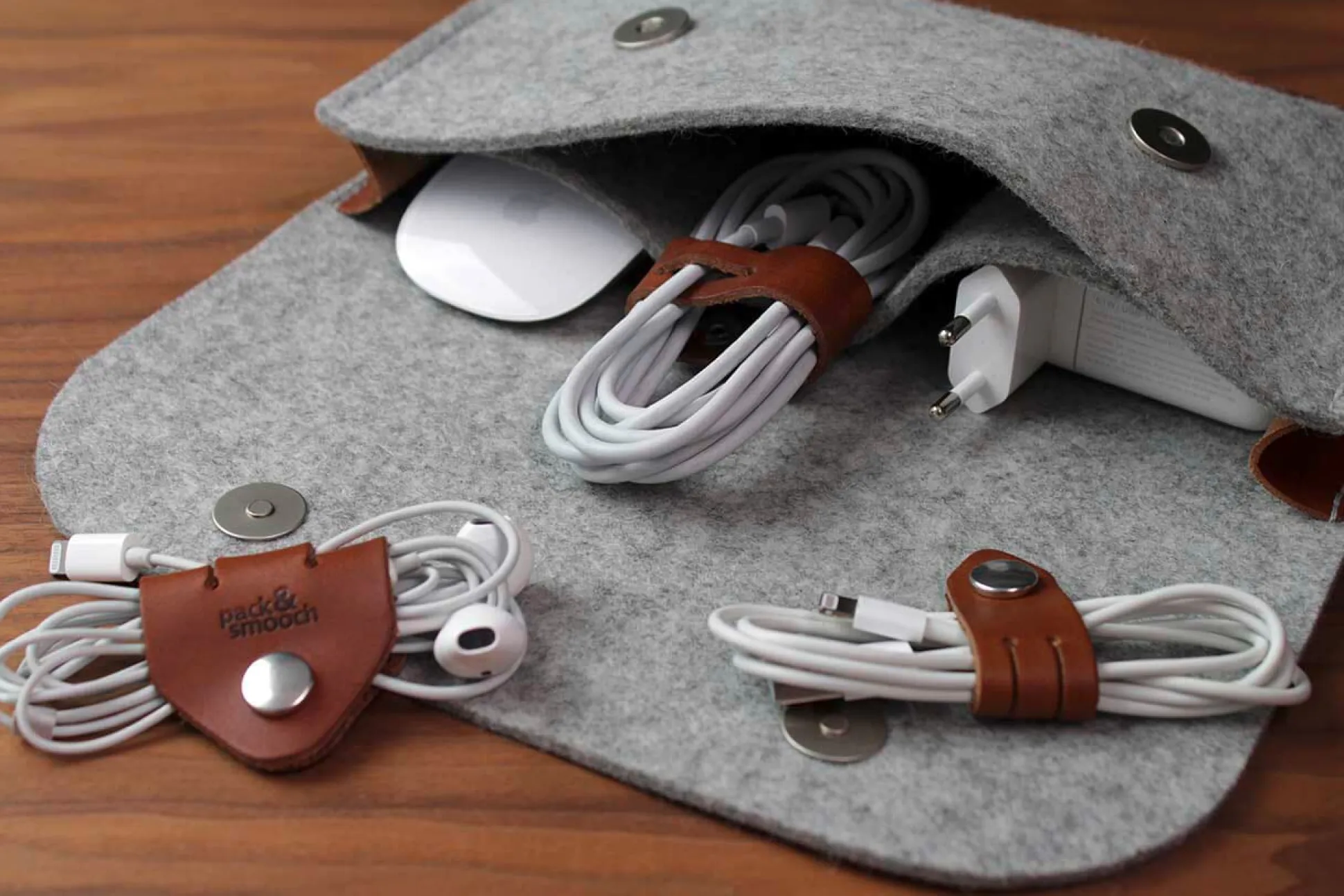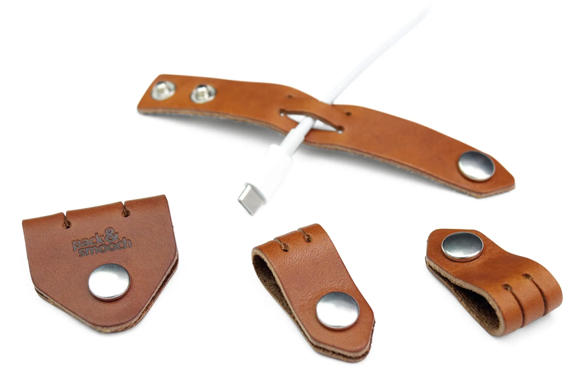 Vierteiliges Set von Kabelbindern aus naturfarbenem Leder: räumt auf mit Verknoten und Verheddern und nimmt verschiedenste Kabel sicher in den Griff. Dabei wird ein Kabelende durch zwei Schlitze des jeweiligen Lederbands geführt, um beim nächsten absehbaren Bedarf gleich wieder griffbereit zu sein.