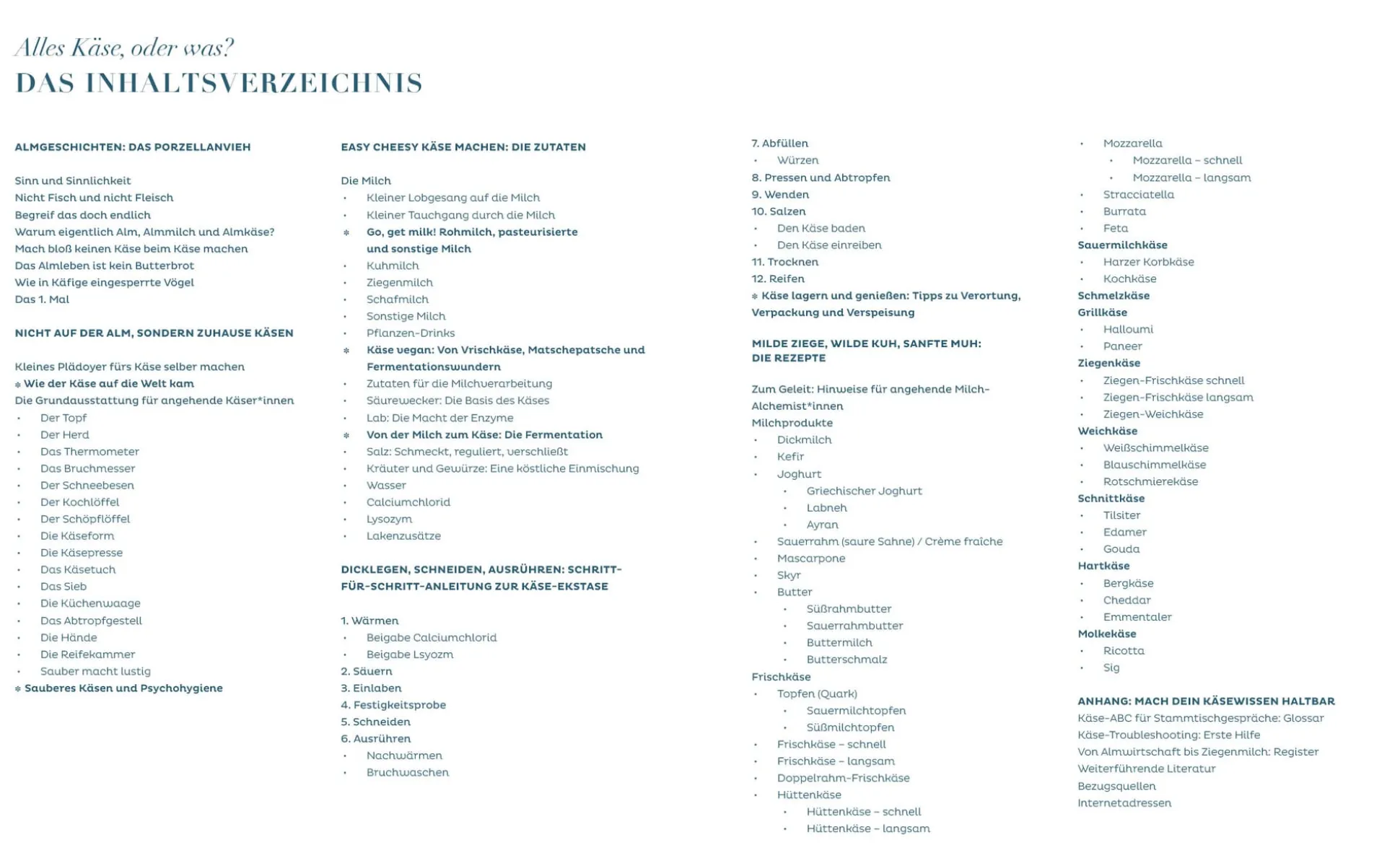 Mit den simplen Schritt-für-Schritt-Anleitungen in diesem Buch hast du den Käse-Dreh schnell raus. Denn hier lernst du alles über Käsebruch, Ausrühren, Einlaben, Trocknen und Reifen. Und dann heißt es nur noch ausprobieren, experimentieren und natürlich verkosten – egal ob du auf Frischkäse abfährst, lieber Ayran nippst, dir dick Butter aufs Brot schmieren willst oder mehr der reife Bergkäse-Typ bist – bei dieser Auswahl wirst du garantiert fündig: von Mascarpone, Mozzarella, Feta über Halloumi, Blau-, Weiß- und Rotschimmelkäse bis hin zu Gouda, Tilsiter und Ricotta – let’s cheese it! Das heißt, sobald du es schaffst, dich von Marlene Kelnreiters Fernweh-weckenden Almgeschichten und den fantastischen Bildern loszureißen – so schön war Käsemachen noch nie.