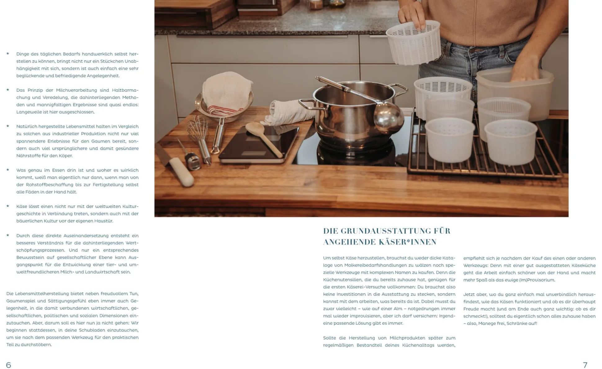 Um selbst Käse herzustellen, brauchst du keine speziellen Werkzeuge. Denn die Küchenutensilien, die du bereits zuhause hast, genügen für die ersten Käserei-Versuche vollkommen: Dabei musst du zwar vielleicht – wie auf einer Alm – manchmal improvisieren, aber irgendeine passende Lösung gibt es immer. Also, Manege frei, Schränke auf! Dein Hauptwerkzeug sind ohnehin deine Hände und das Wissen, wie du die richtige Temperatur misst und welche hygienische Vorsorgemaßnahmen du treffen solltest, damit aus deinen Milchträumen kein Worst Käs scenario wird. Zum Drüberstreuen und je nach Geschmack braucht es dann nur noch Zutaten wie Salz, Kräuter und Gewürze. Wenn du das Grundprinzip einmal draufhast, sind die Möglichkeiten und vor allem die Geschmackserlebnisse endlos.