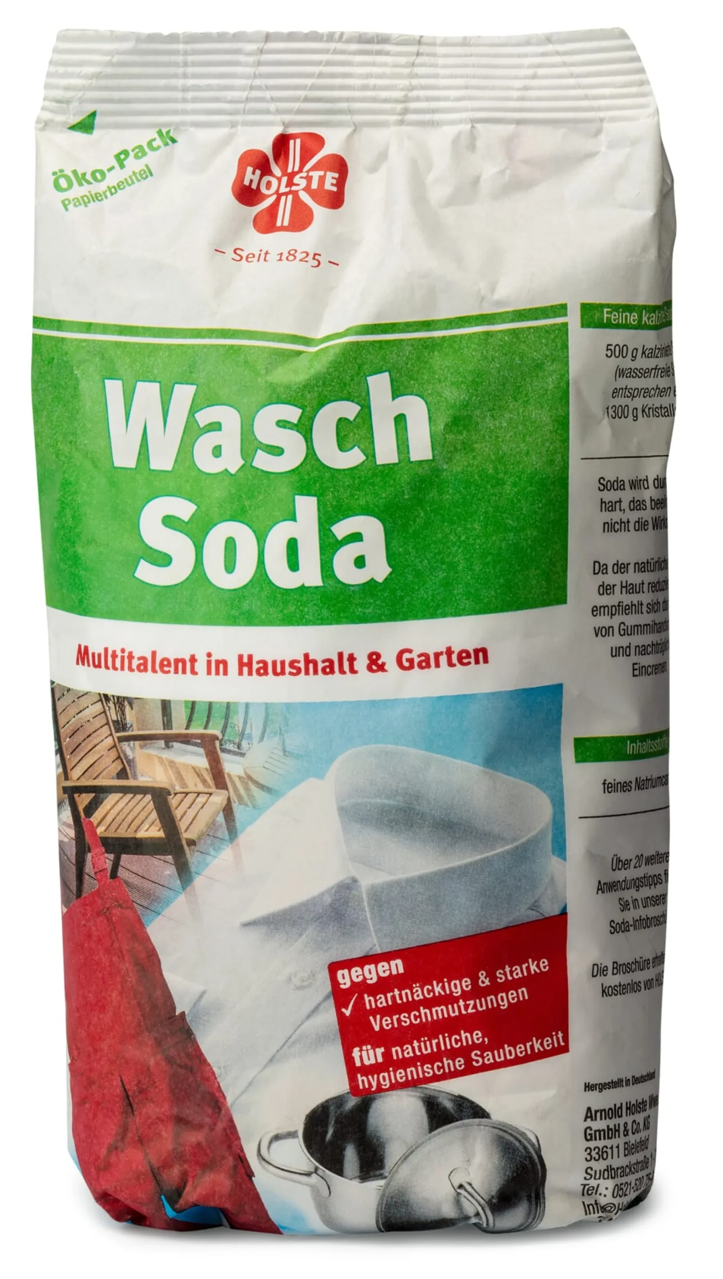 Oder Natriumcarbonat: ein altes, universelles Reinigungsmittel für tausendundeinen Zweck. In Wasser gelöst, wird es zur Lauge und bringt als solche Schmutz und Fett zum Aufquellen und in eine wasserlösliche Form; Härtebildner wie Kalk werden ausgefällt. Die vielen sinnvollen Verwendungszwecke können wir hier nur andeuten: zum Einweichen und Vorwaschen pflanzlicher Gewebe. Zum Spülen, als vollständiger oder teilweiser Ersatz harter, chemischer Spülmittel. Zur radikalen Fettbekämpfung überall; gegen Algen an Steinplatten und Zäunen …