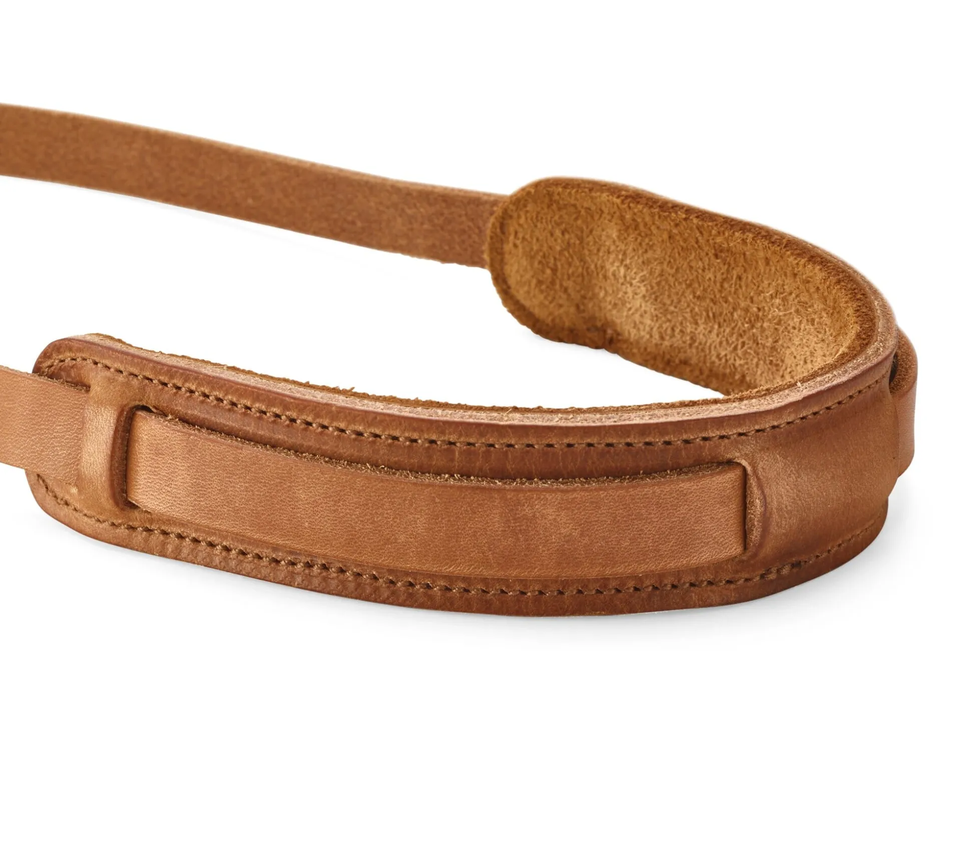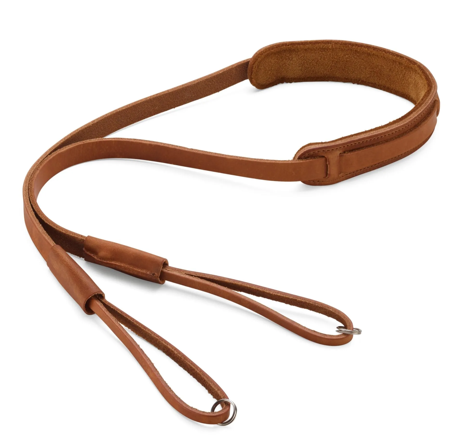 Altgrubengegerbtes Rindleder, wie man es früher zur Herstellung von Zaumzeug und Schirrung verwendet hat, begegnet Ihnen hier wieder. Die Riemen sind aus dem sogenannten Kernstück geschnitten, aus der Rückenpartie, wo die Lederfasern ihre feinste und zugleich dichteste Struktur aufweisen. Bei aller Robustheit bleibt das Material überaus biegsam und flexibel – besser geht es nicht für diesen Zweck. Der Hersteller unserer Kameragurte in Hamburg bezieht dieses Leder aus einer Gerberei in Norddeutschland. Ein Polster aus weichem Elchleder schont Nacken- sowie Schulterbereich und lässt die Kamera auch bei langem Tragen nicht zur Last werden. Zwei Möglichkeiten der Befestigung an der Kamera sind vorgesehen, abhängig vom Modell: mittels der Ringe aus Federstahl oder alternativ, indem die schmalen Enden der Riemen durch die am Kamerakörper vorgesehenen Ösen gezogen werden. Knopfniete aus Messing dienen dann dem Öffnen und Schließen der Schlaufen.