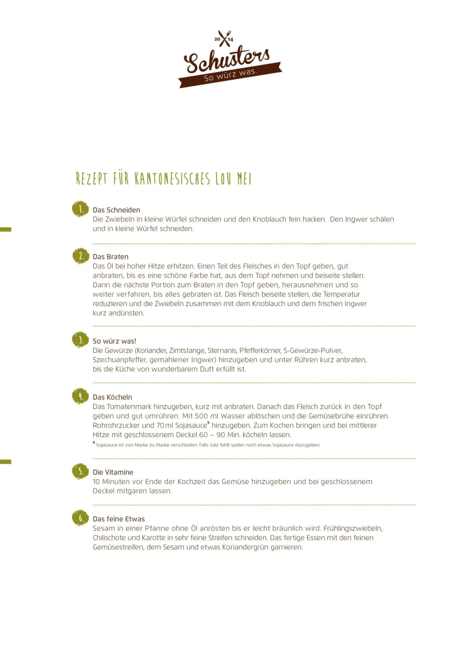 Unter den vielfältigen Regionalküchen Chinas ist die kantonesische wahrscheinlich die bekannteste. Ihren Ursprung hat sie im südlichen Guangdong, der bevölkerungsreichsten Provinz des Landes. Lou Mei beschreibt dort Gerichte, die in einem Master Stock, der „perfekten Brühe“, gekocht wurden. Schusters Würzerei hat dazu einen Gewürzbrief mit Zucker, Sesam, Gemüsebrühe, 5-Gewürze-Pulver, Zimtstange, Sternanis, Szechuanpfeffer, Koriander, Ingwer und Pfeffer zusammengestellt. Die kräftige, geschmackvolle Brühe ist allerdings viel zu schade, um nur als Kochbasis zu dienen – Schusters Würzerei empfiehlt deshalb, sie gleich mitzugenießen.