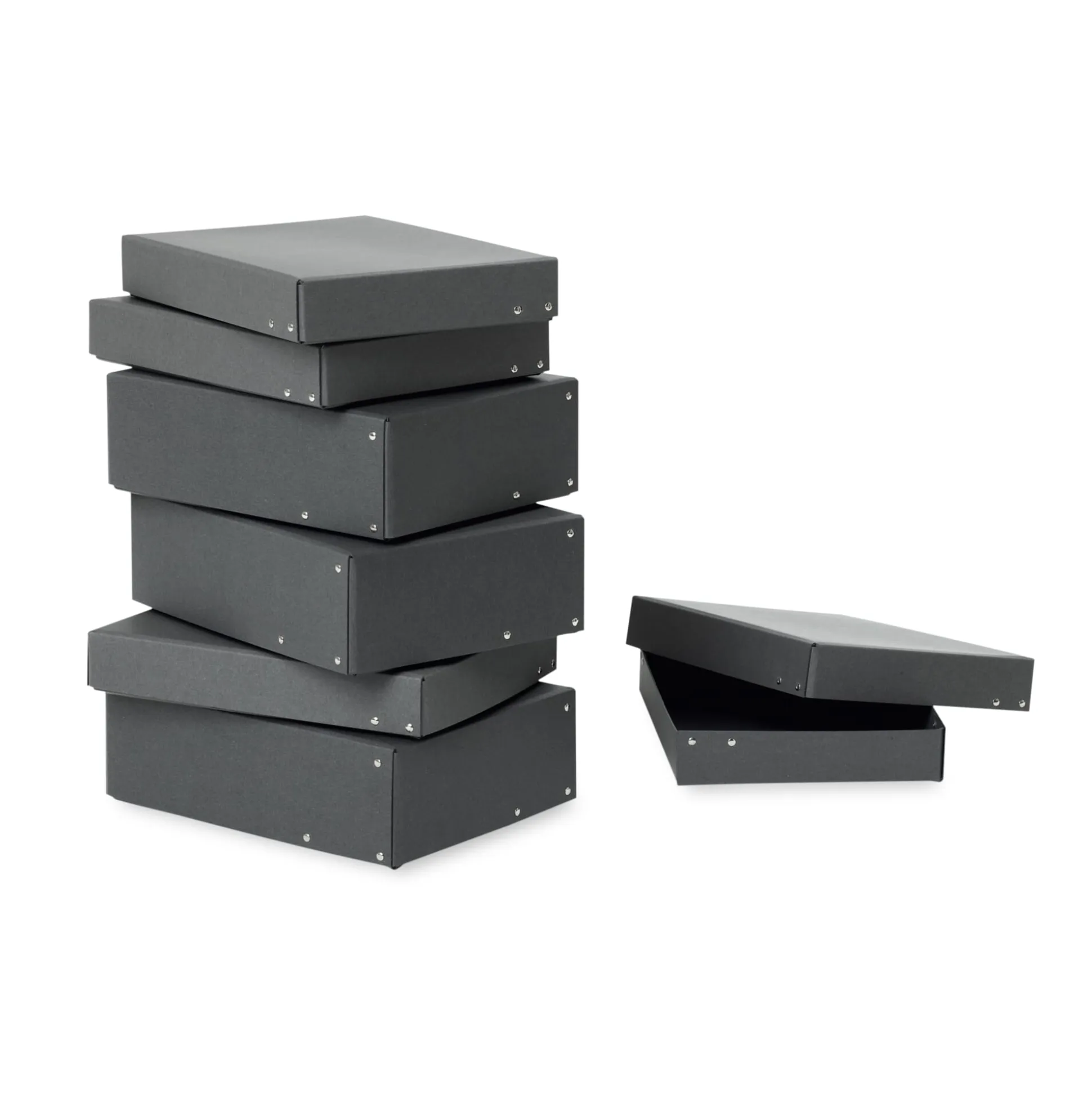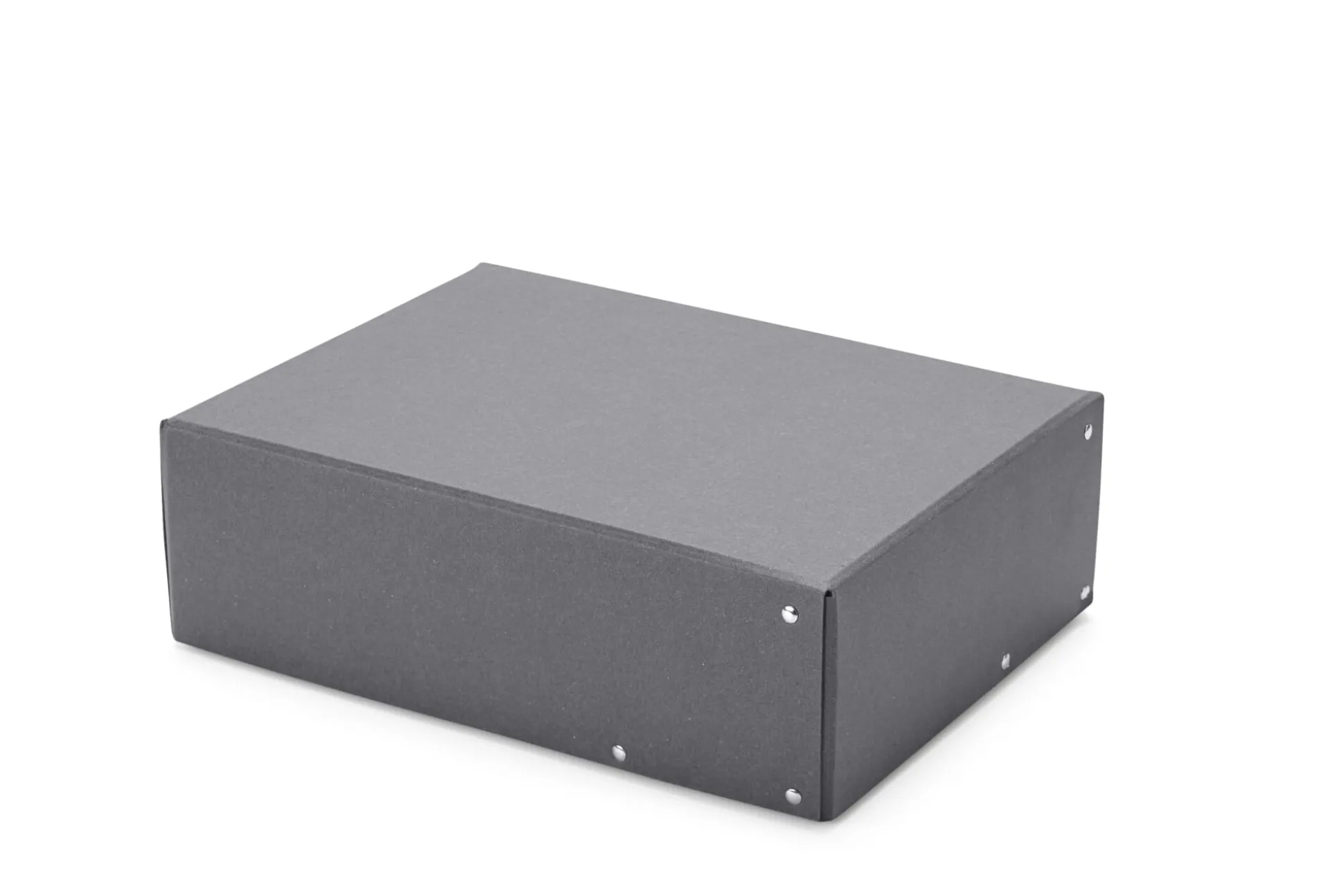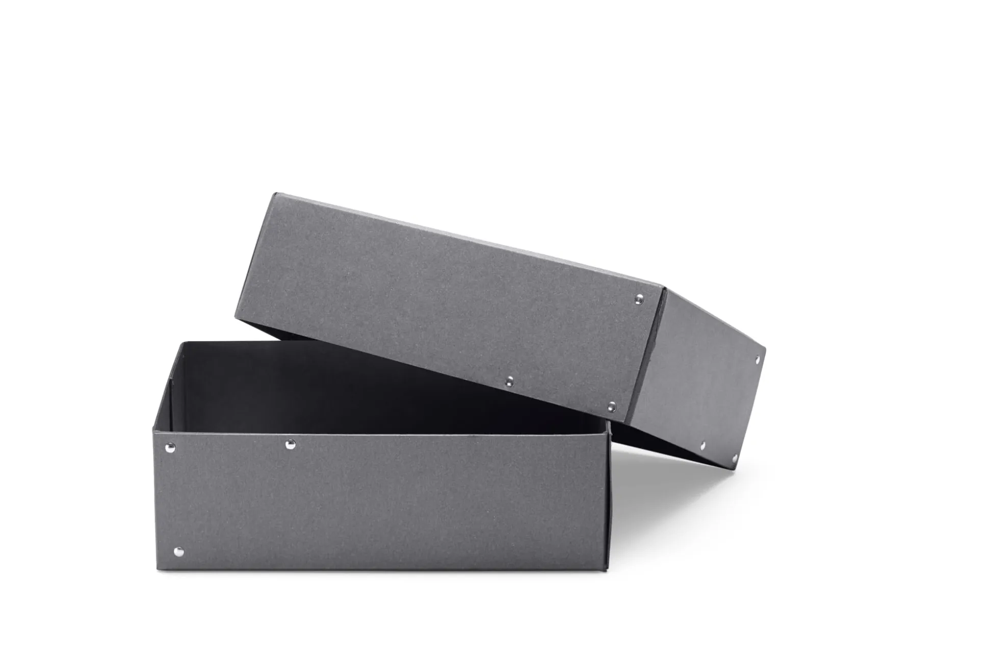 Ursprünglich aus der Filmindustrie und dort im anderen Format für konventionelle Filmrollen genutzt: Genietete Archivboxen, in Berlin produziert, mit Stülpdeckel, gefertigt aus schwarzgrau durchgefärbter Hartpappe, beidseitig unbehandelt. Der Farbton entspricht ungefähr Pantone Black 430 U.