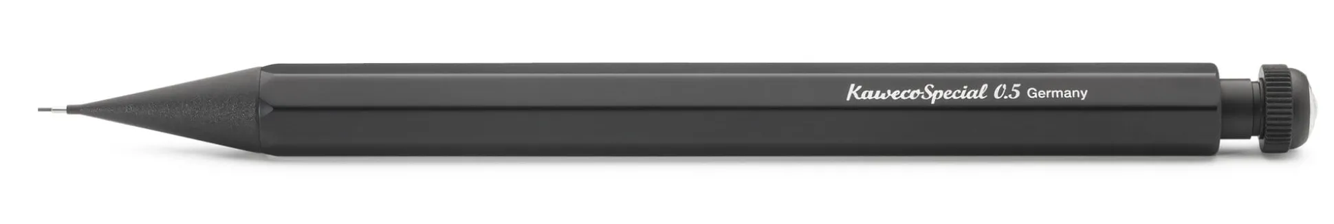 Unser Wiedergänger der seit 1910 von Kaweco in Heidelberg produzierten und damals als Füllbleistift bezeichneten Druckbleistifte – sie wurden in einem kaum nachvollziehbaren Variantenreichtum angeboten, darunter die Modelle „Rationell“ und „Special“ – kann davon ein Lied singen. Denn der wiederaufgelegte Kaweco Special unterscheidet sich in mehrfacher Hinsicht vorteilhaft von seinem Urbild. Jedenfalls ist das Gehäuse heutzutage nicht aus Zelluloid oder Ebonit, sondern aus durablem, schwarz eloxiertem Aluminium gefertigt; die vormalige Drehmechanik ist einer zeitgemäßeren und vor allem stabileren Vorschub-Druckmechanik mit Minenreservoir gewichen; derentwegen konnte ein Radiergummi eingebaut werden, der sich nach Abnutzung auswechseln lässt; und es gibt den Druckbleistift in vier verschiedenen Varianten für die Verwendung von vier verschiedenen Minenstärken – ganz nach gewünschtem Verwendungszweck.