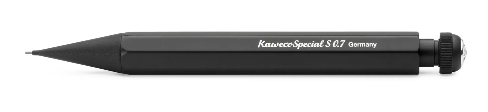 Druckbleistift mit Vorschubmechanik. Achtkant-Gehäuse und Kopfstück aus schwarz eloxiertem Aluminium. Druckmechanik Messing. Länge 10,5 cm. Gewicht 15 g. Mit auswechselbarem Radiergummi (Ausführung mit 2,0-mm-Mine ohne Radiergummi). Lieferung im Blechetui.