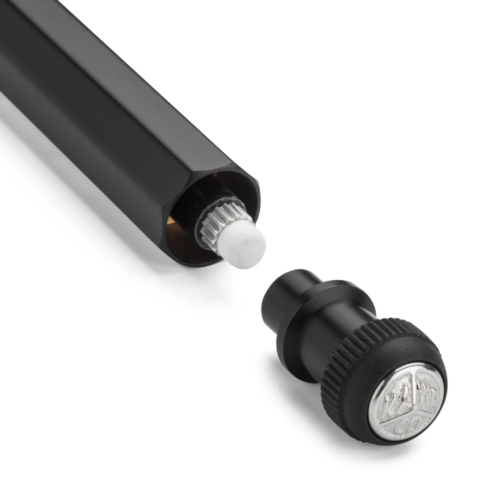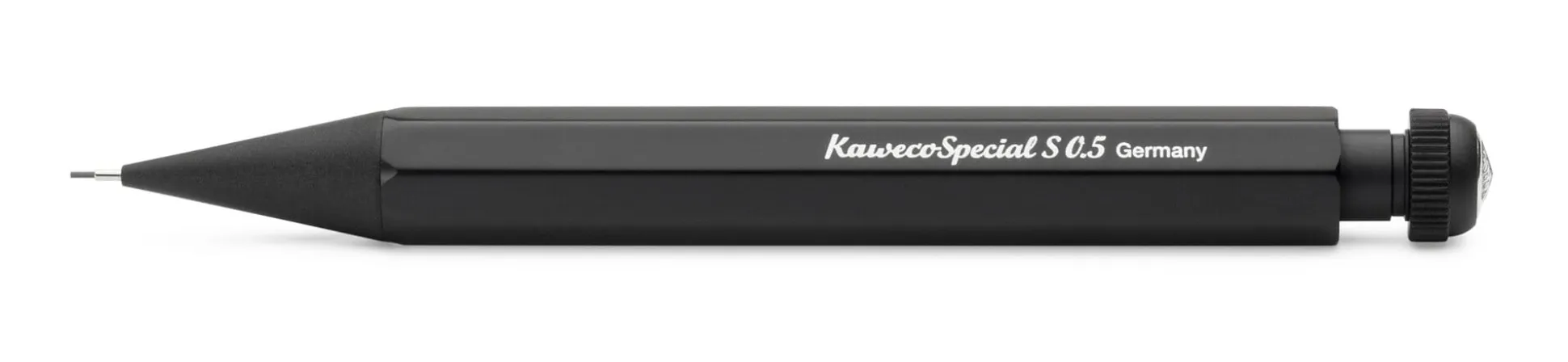 Druckbleistift mit Vorschubmechanik. Achtkant-Gehäuse und Kopfstück aus schwarz eloxiertem Aluminium. Druckmechanik Messing. Länge 10,5 cm. Gewicht 15 g. Mit auswechselbarem Radiergummi (Ausführung mit 2,0-mm-Mine ohne Radiergummi). Lieferung im Blechetui.