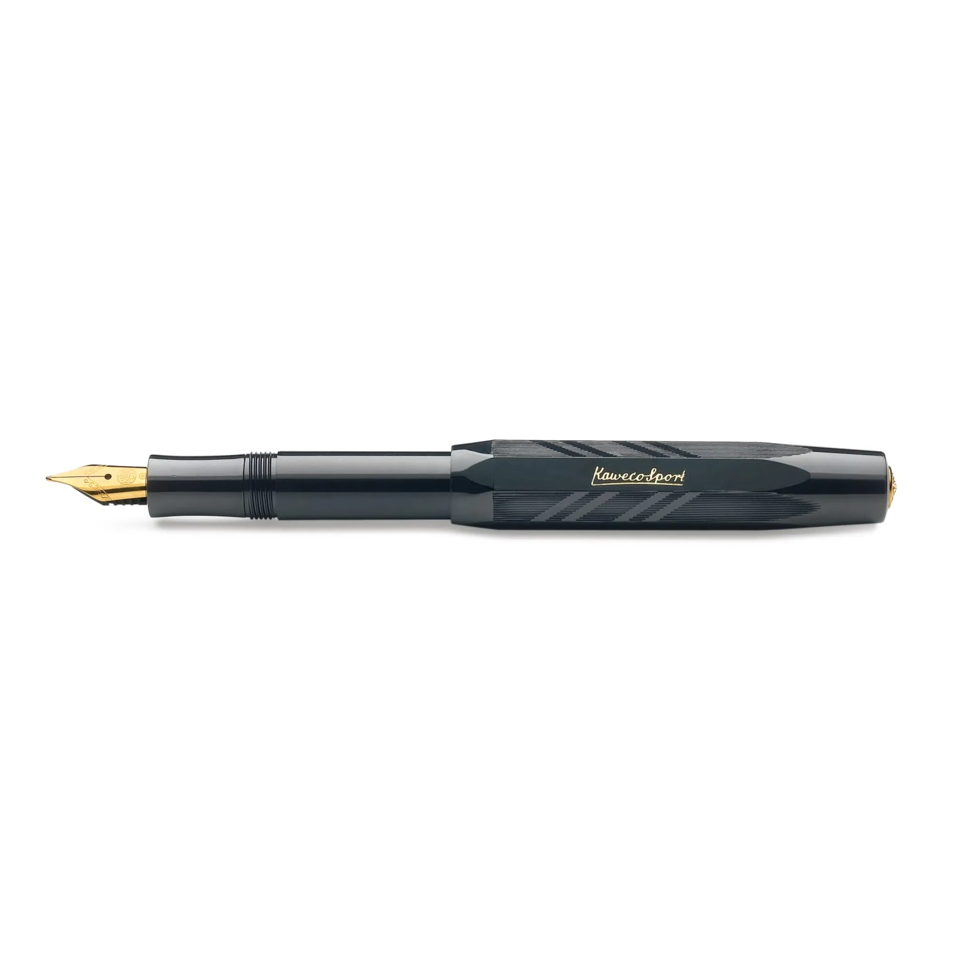 Die 1883 in Heidelberg gegründete Federhalterfabrik Koch, Weber & Co. war zeitweilig einer der bedeutendsten deutschen Hersteller von Füllfederhaltern und Zubehör, und einer der findigsten dazu: Der erste wirklich auslaufsichere „Sicherheitsfüller“ deutscher Produktion etwa stammte von dort. 1911 wurde das Modell Sport entwickelt, ein kleiner Füllfederhalter, der (in später leicht veränderter Form) bis 1970 erfolgreich im Programm war – was nicht verwundert, denn einerseits ist der geschlossene Füllfederhalter mit 10,5 cm Länge überaus kompakt, andererseits liegt er mit aufgestecktem Verschluss gut in der Hand – der ideale Reisefüllhalter also. Wir lassen ihn, angelehnt an das Design von 1935, wieder herstellen. Er hat – wie sein Vorbild – eine vergoldete Stahlfeder mit einem Schreibkorn aus Iridium. Und wie es auch Kaweco in späteren Jahren tat, stellen wir ihm mit Kugelschreiber, Druckbleistift und Fallminenstift weitere reise- und hemdtaschentaugliche Schreibgeräte an die Seite. In dieser Ausführung – mit schwarzem Gehäuse und guillochiert – gibt es sie nur bei uns.