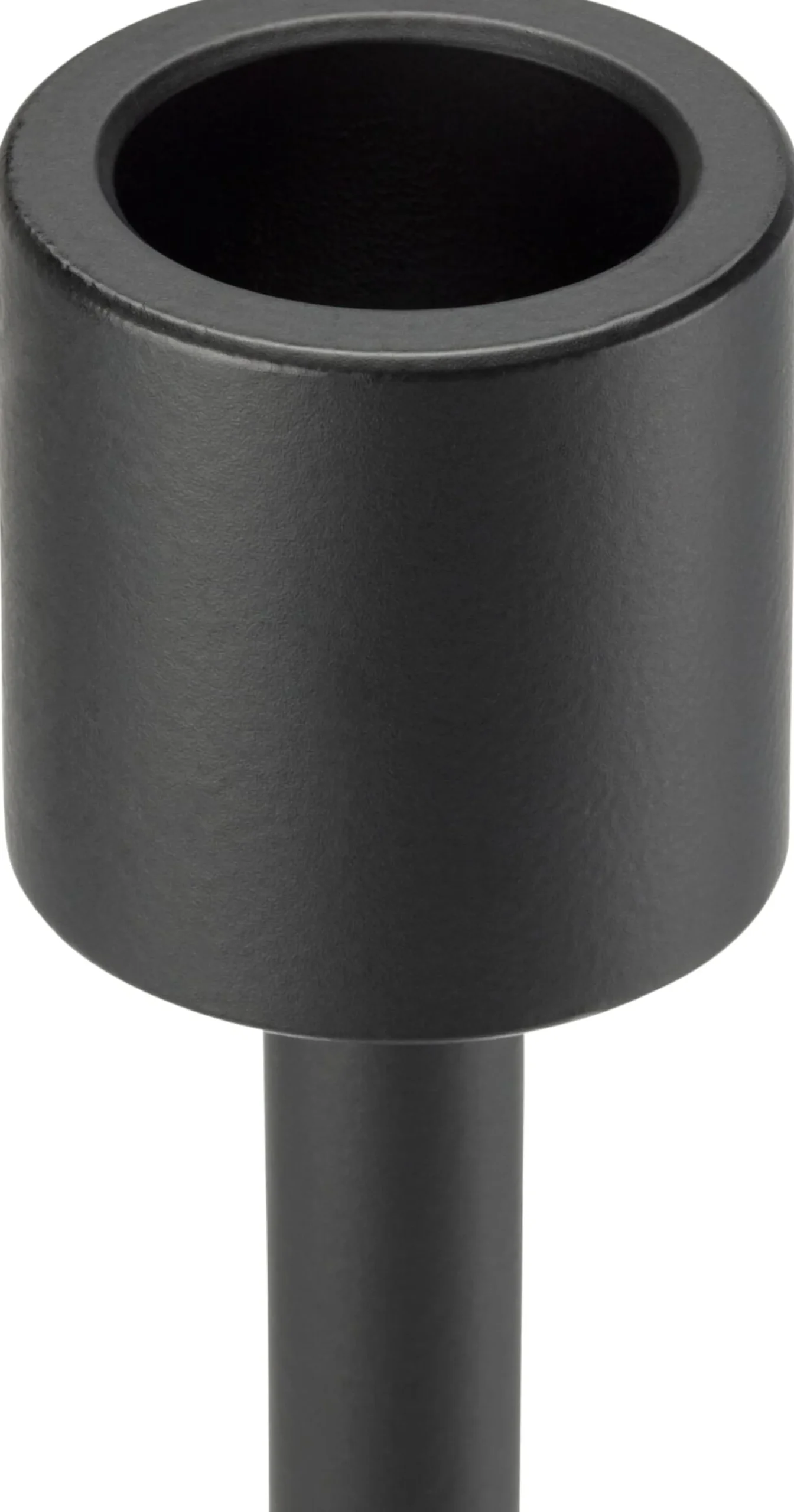 Stahl, schwarz pulverbeschichtet. Fuß Ø 8 cm, Höhe 8 mm. Kopf Ø 3 cm, Höhe 3 cm. Kerzenaufnahme Ø 2 cm, Höhe 2 cm. Stiel Ø 1 cm.