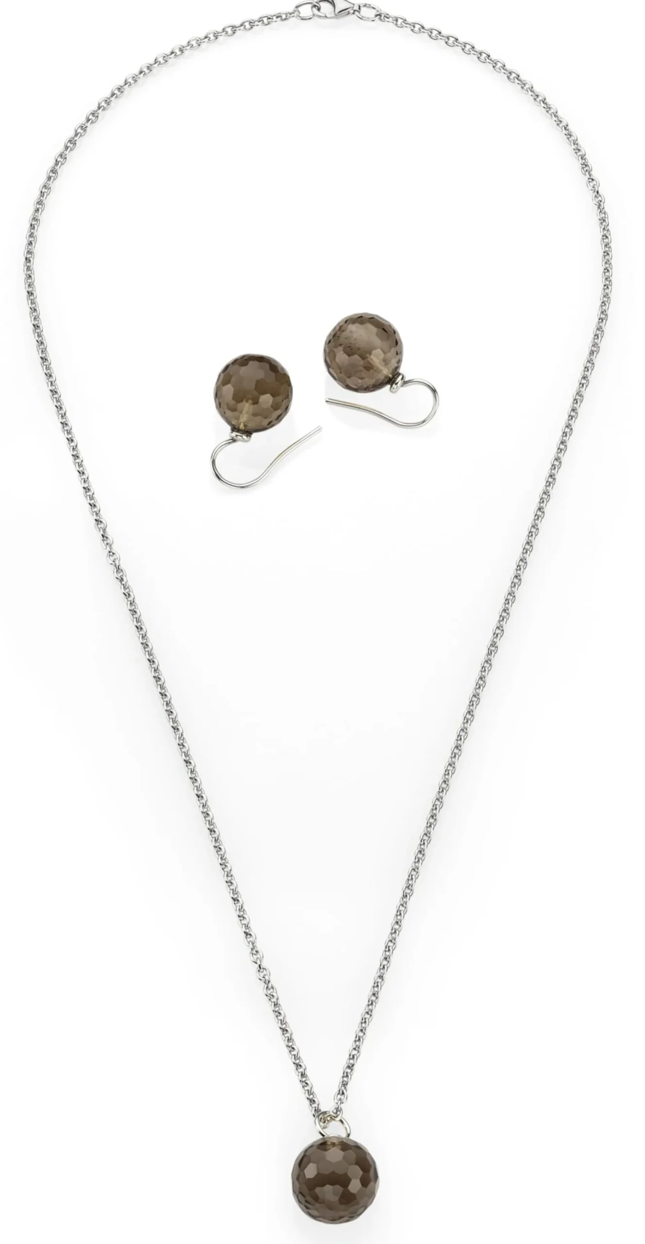 Den Anhänger dieser Kette fertigt Ménard aus einer Rauchquarzkugel mit Facettenschliff in Form kleiner Sechsecke. Je nach Lichteinfall zeigt er beim Tragen ein feines Glitzern. Die filigrane Ankerkette mit Karabinerhakenverschluss besteht aus 925er Silber.