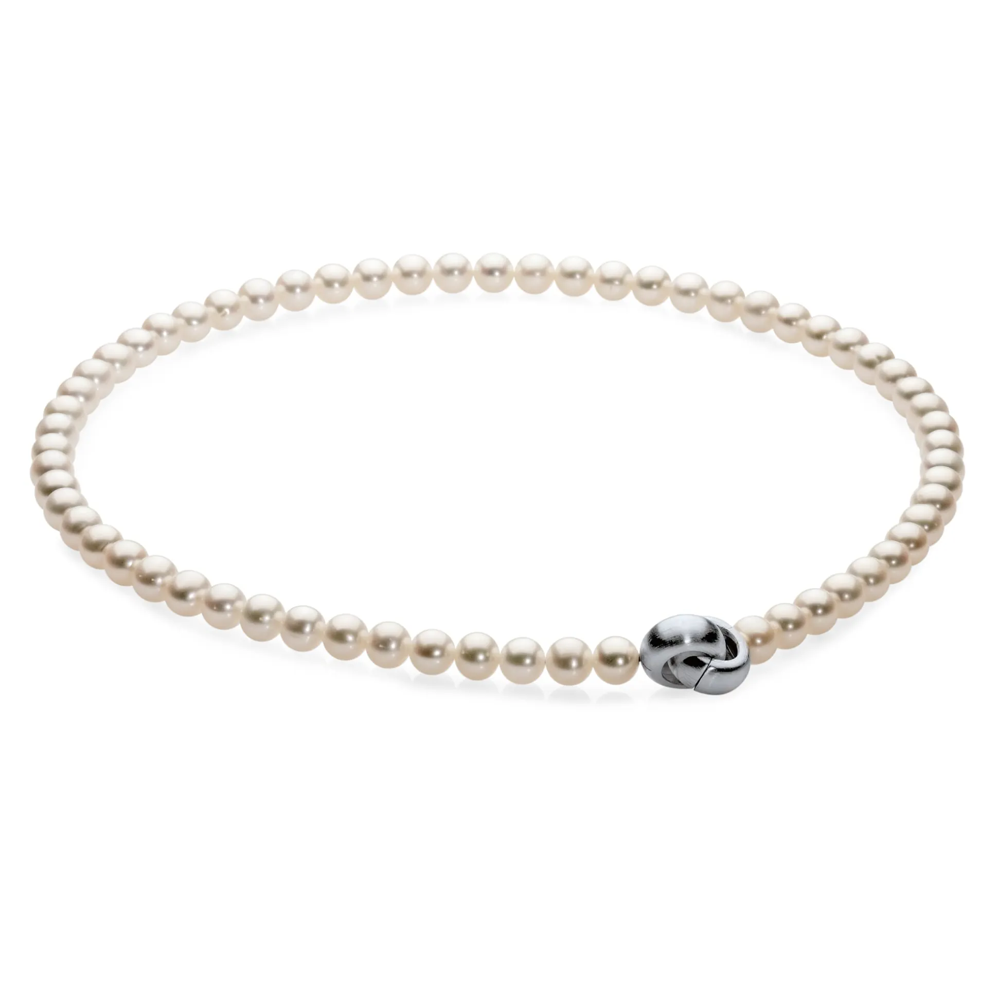 Diese matt schimmernde Kette aus Süßwasser-Zuchtperlen stammt aus einer Pforzheimer Schmuckwerkstatt. Die Schließen bestehen aus 925er Silber. Sie haben die Form massiver, mattierter Ringe, von denen sich einer aufklappen lässt.