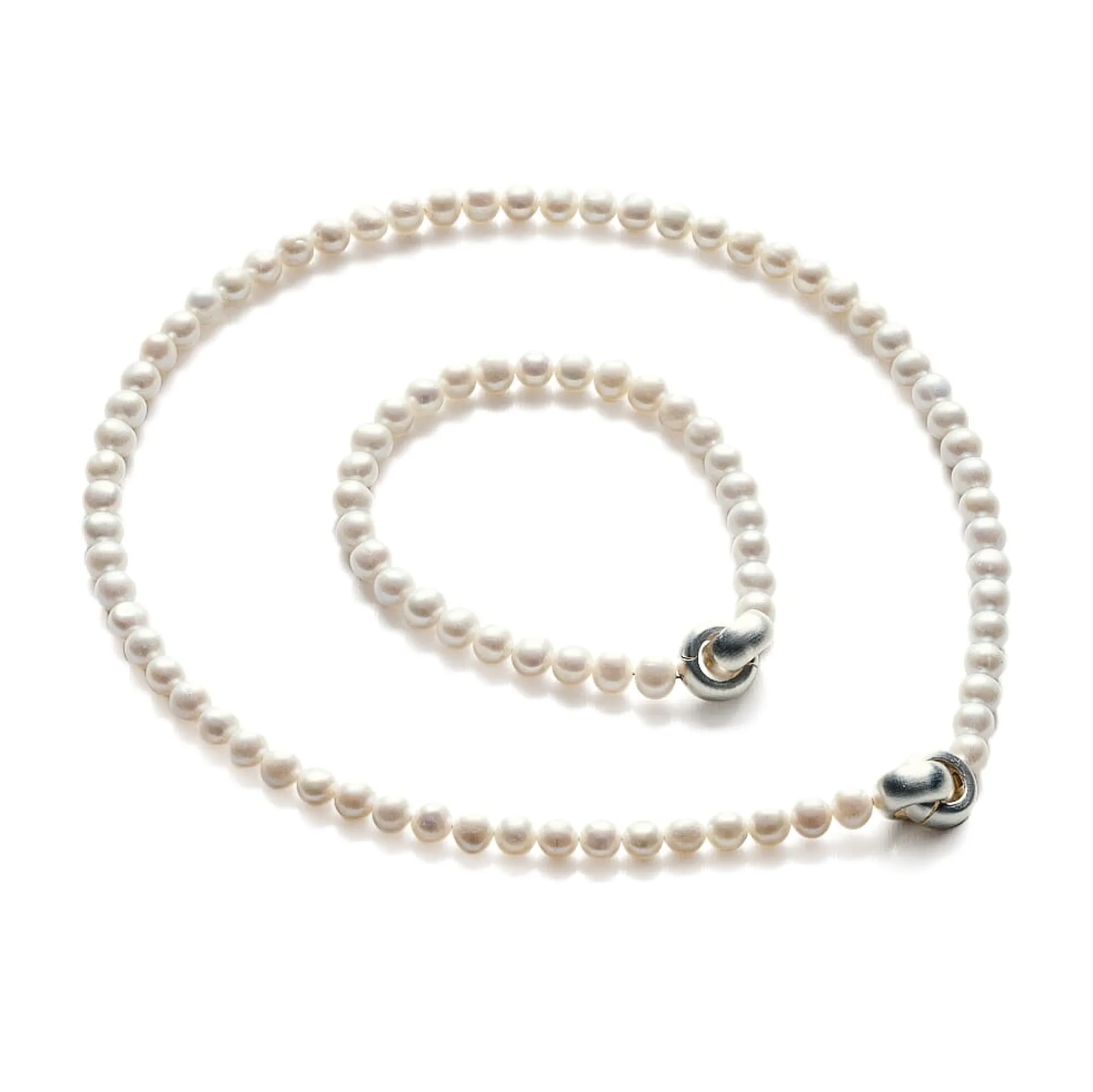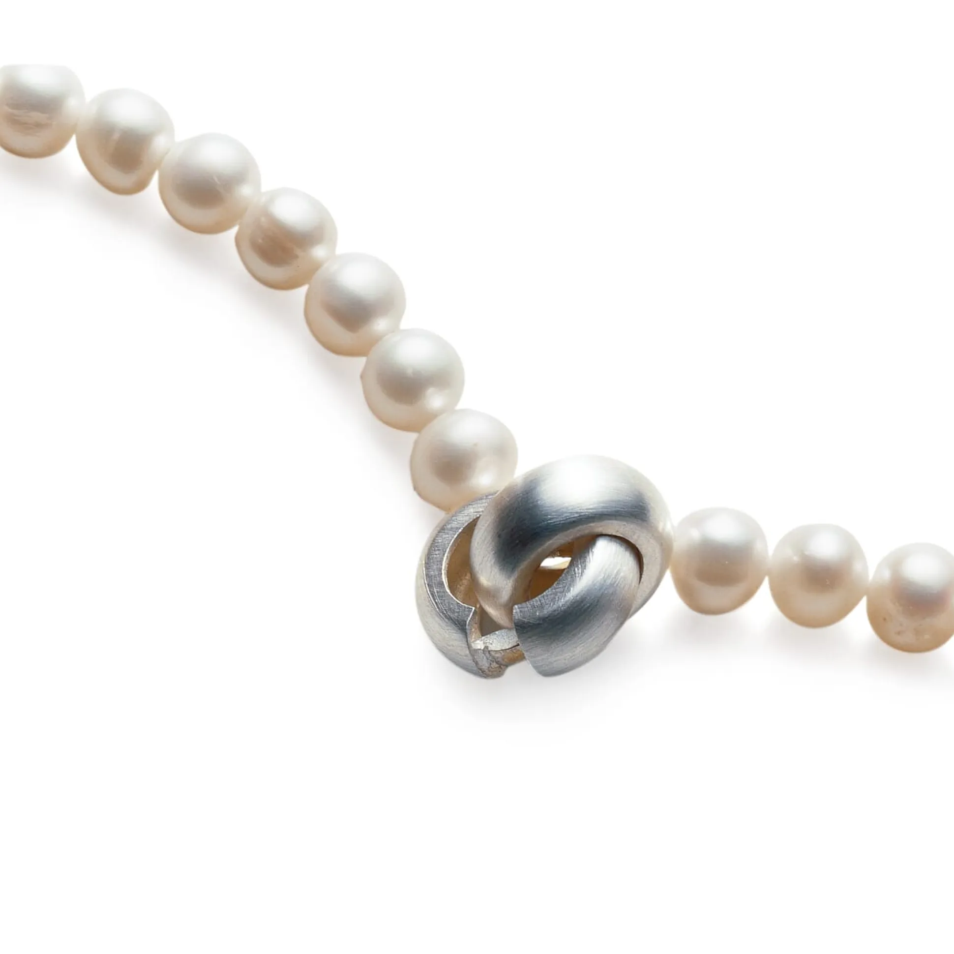 Süßwasser-Zuchtperlen, Ø 6,5–7 mm. Schließe aus zwei massiven, mattierten Silberringen (925er Silber). Collierlänge 42 cm. Gewicht ca. 27 g.