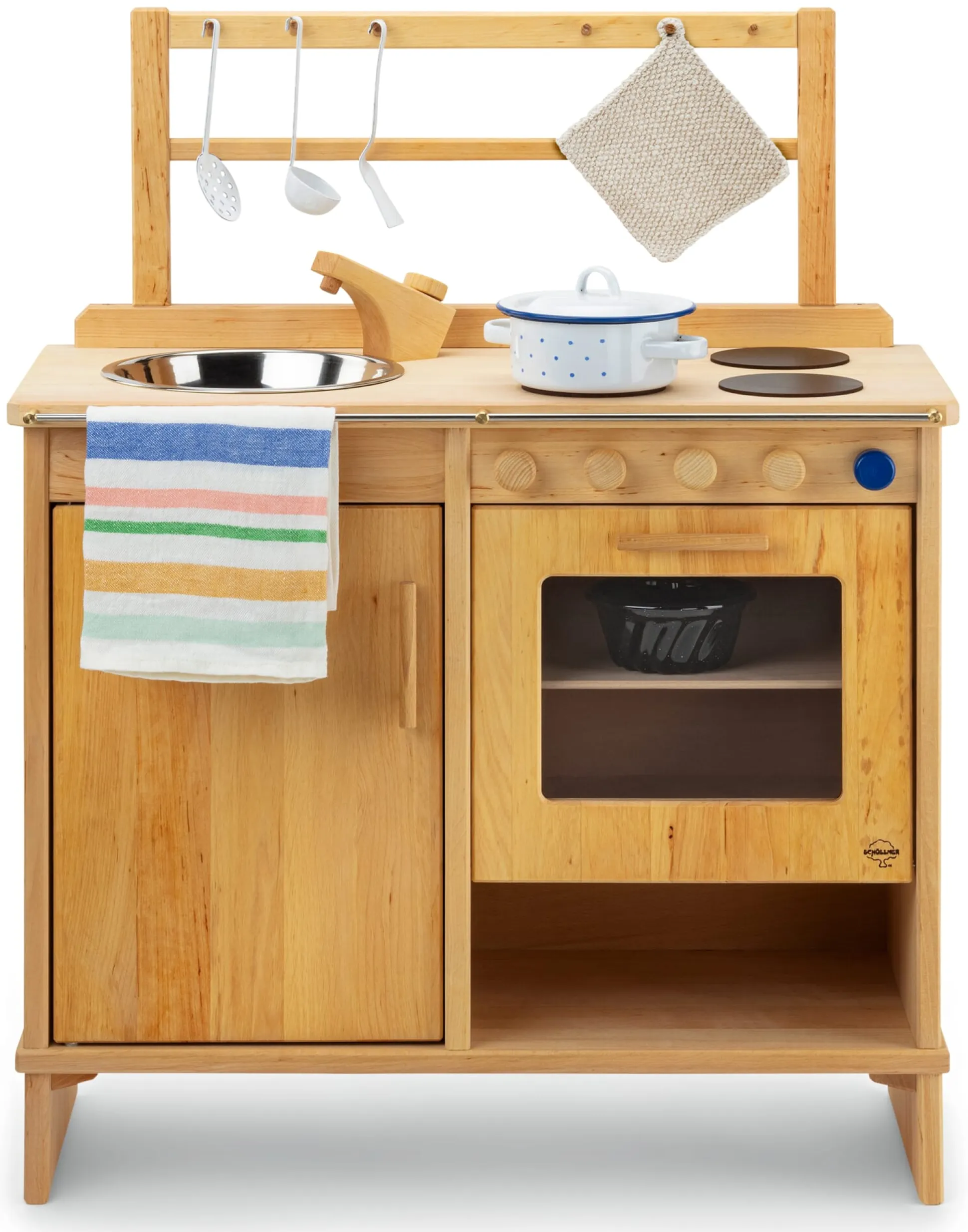 Den erforderlichen Stoizismus bringt diese Kinderküche mit. Sorgsam aus massivem geöltem Erlenholz gefertigt, macht das Spielmöbel gelassen mit, was Ihre Sprösslinge ihm abverlangen. In dem kompakten Küchenblock finden Nachwuchsköch*innen eine sorgfältig nachgebaute Grundausstattung vor: Herdplatten und einen Backofen, eine Spüle mit Edelstahlbecken und Holzarmatur, einen Kühlschrank (auch als Unterschrank zu nutzen) sowie eine aufgesetzte Halterung für Küchenutensilien. Die puristische Gestaltung lässt kindliche Phantasie frei fliegen. Ob Superhelden-Auflauf mit Holzkartoffeln und Filzspiegelei, ob spontane Emailleteller-Wäsche in der Spüle oder Küchenkonzert mit dem Kochlöffel: Angeregt können Kinder hier rühren und stampfen, Einkäufe ein- und ausräumen und vielleicht sogar hingebungsvoll spielerisch den Abwasch erledigen.