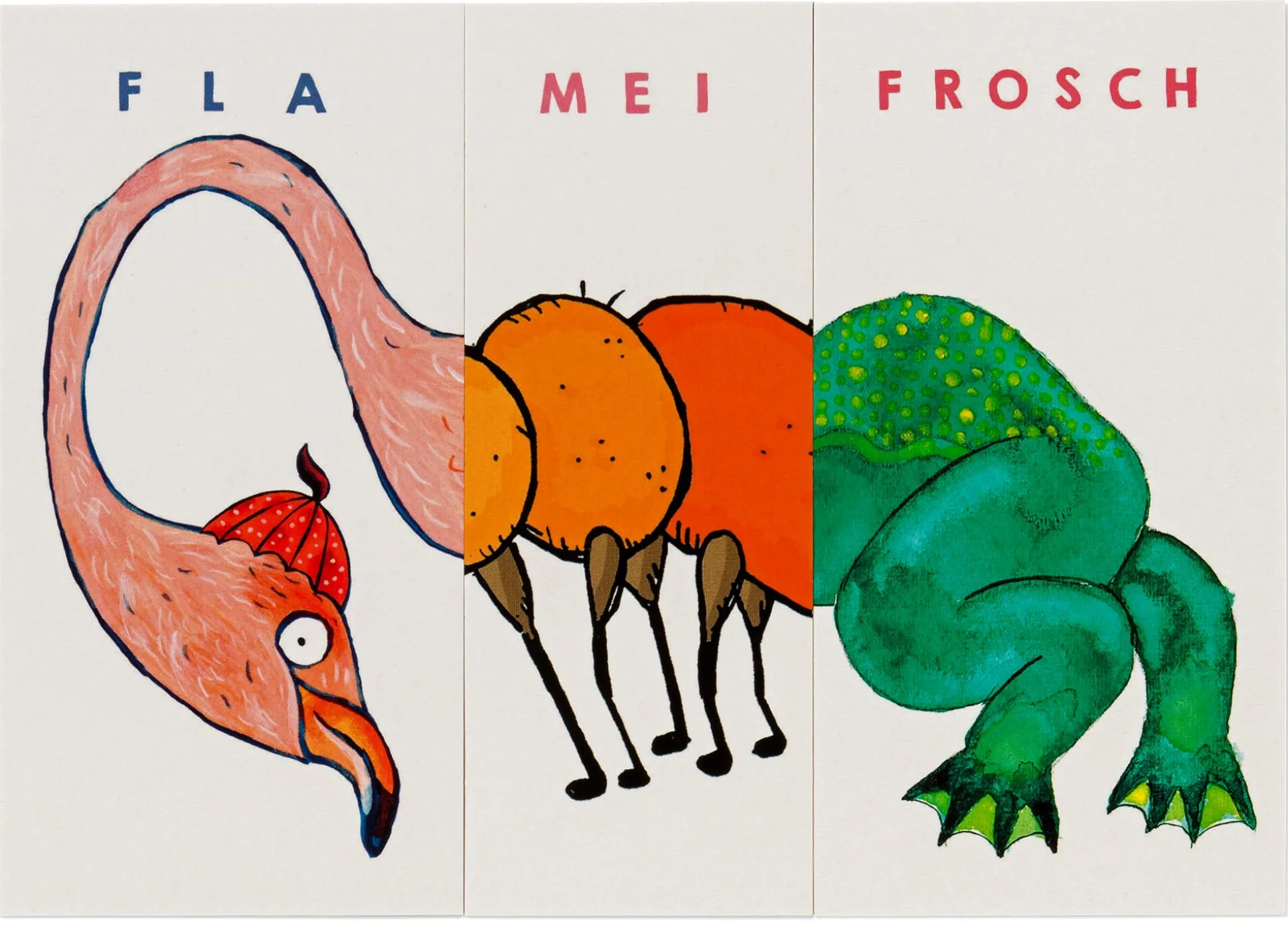 Doch damit hört der Spaß längst nicht auf, denn auf den Rückseiten der Karten sind die Tiere in Kurzgedichten porträtiert, deren Teile beim Spielen ebenfalls neu zusammengestellt werden … Dass die Kinder nebenbei die Möglichkeiten der Silbentrennung, der Wortkombinatorik und -neuschöpfung lernen, sei hier ebenfalls nur nebenbei erwähnt, denn im Vordergrund stehen der Spaß an Kunst und Sprache und die Lust an Wortspielen.
