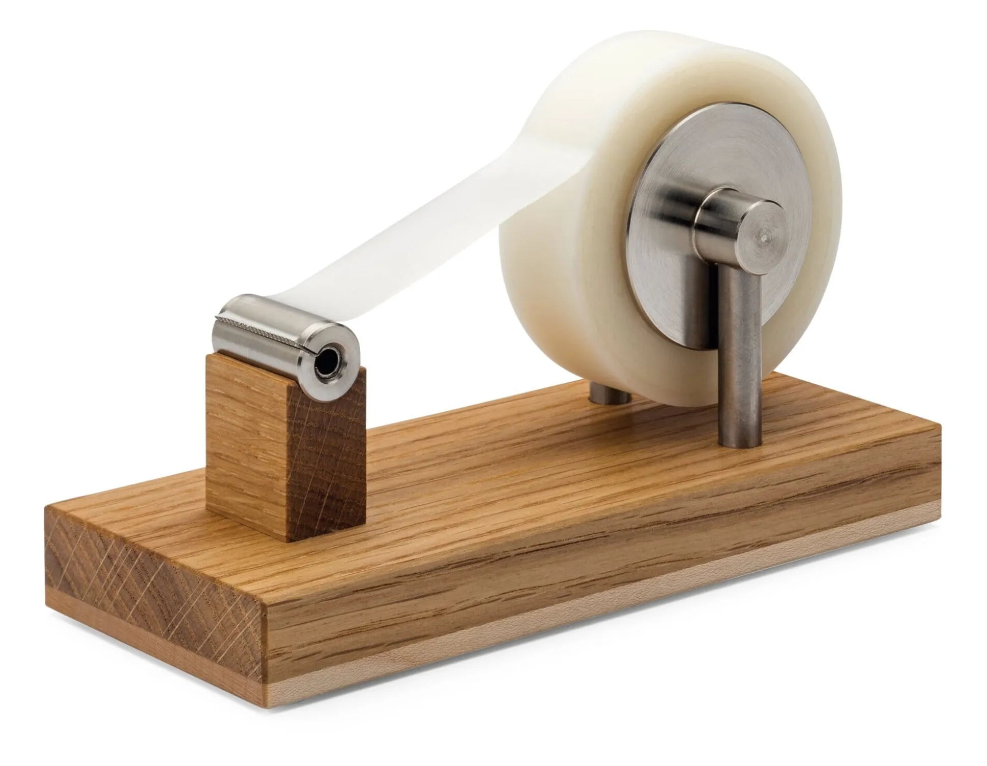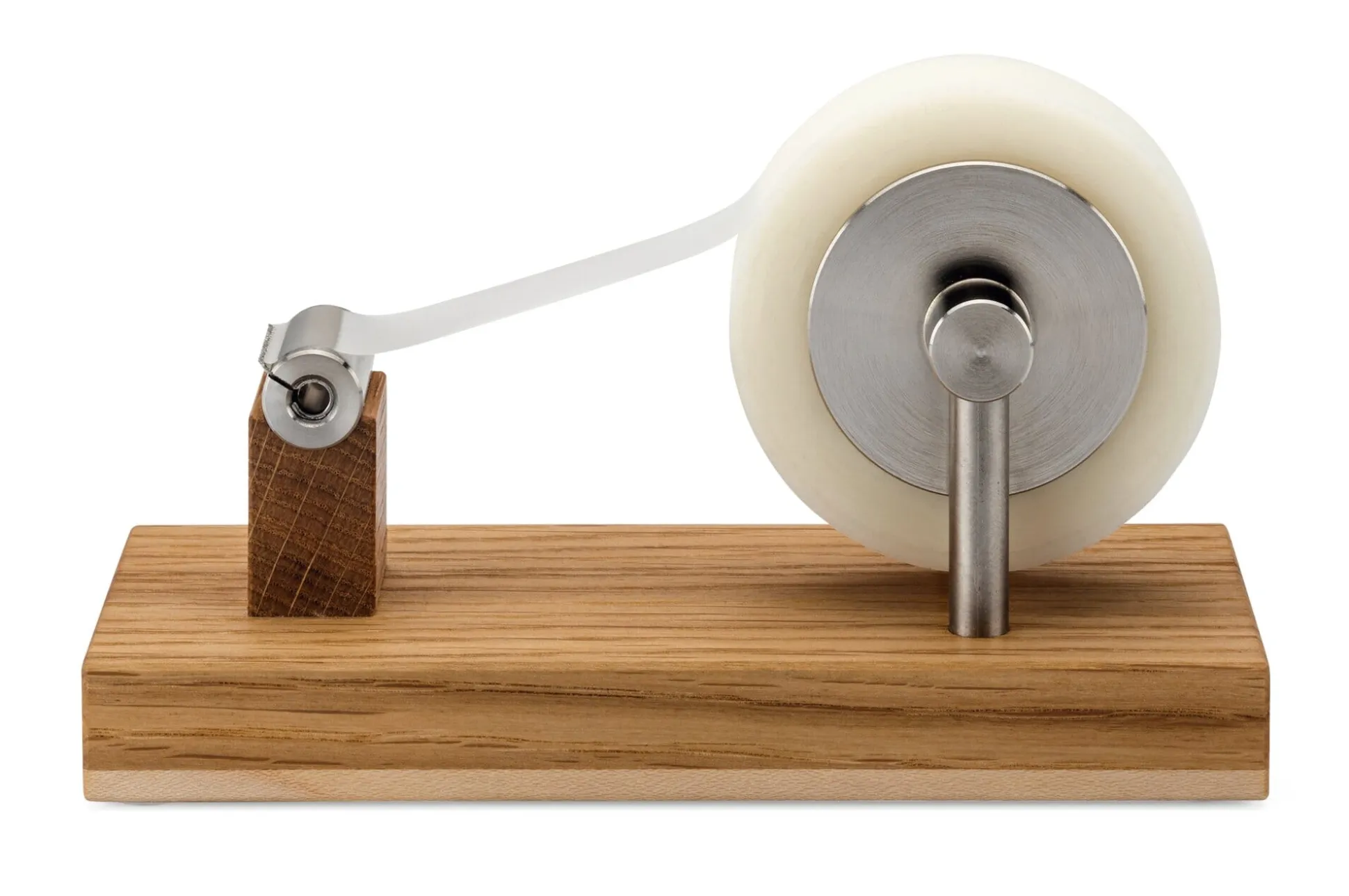 Dieser Klebefilmabroller aus dem bayerischen Steinhöring erinnert mit seiner Holzbasis an ein wissenschaftliches Funktionsmodell alter Schule. Gestalterisch überzeugt insbesondere die Kombination der sehr unterschiedlichen Materialien (Eiche, Ahorn und Edelstahl). Seine Anmutung wird selbst durch Klebebandrollen mit weniger ansehnlichem Kern nicht gemindert, da dieser durch zwei Edelstahlronden verdeckt wird. Die Edelstahlelemente drehen sich beim Abrollen im Übrigen nicht mit, ausschließlich der Klebefilm gerät in Bewegung. Das Schreibtischutensil eignet sich für Standard-Klebefilmrollen mit einer Breite von 19 mm und einem Kerndurchmesser von 25 mm.