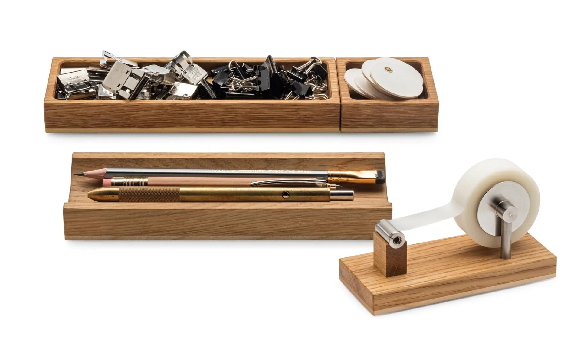 Der bayerische Hersteller fertigt nach unseren Maßgaben ein Reihe Schreibtischutensilien, die durch die Materialität – massives, geöltes Eichen- und Ahornholz – sowie ihre schlichte Gestaltung überzeugen.