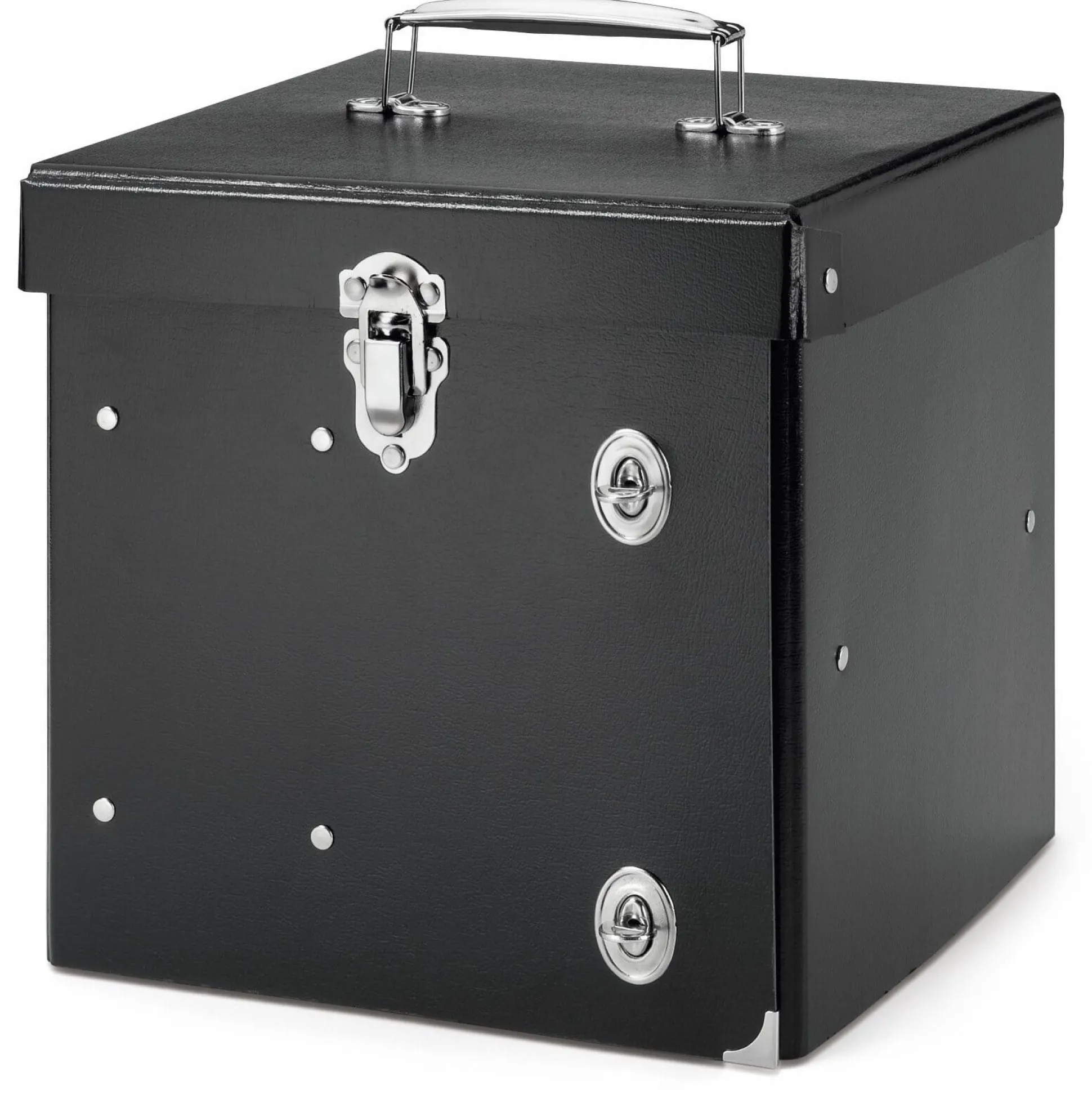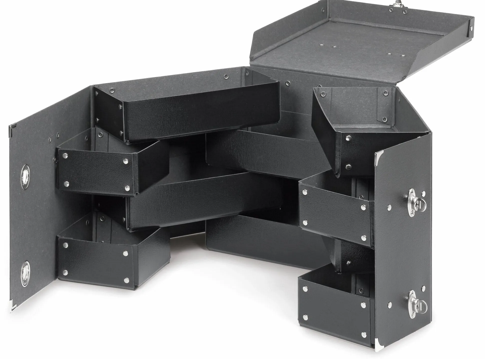 Aus Pappe gebogen, die eingesetzten Fächer sind genietet. Mit Henkel und Verschlüssen aus Stahlblech. Höhe 21 cm, Breite 21 cm, Tiefe 21 cm. Gewicht 820 g.