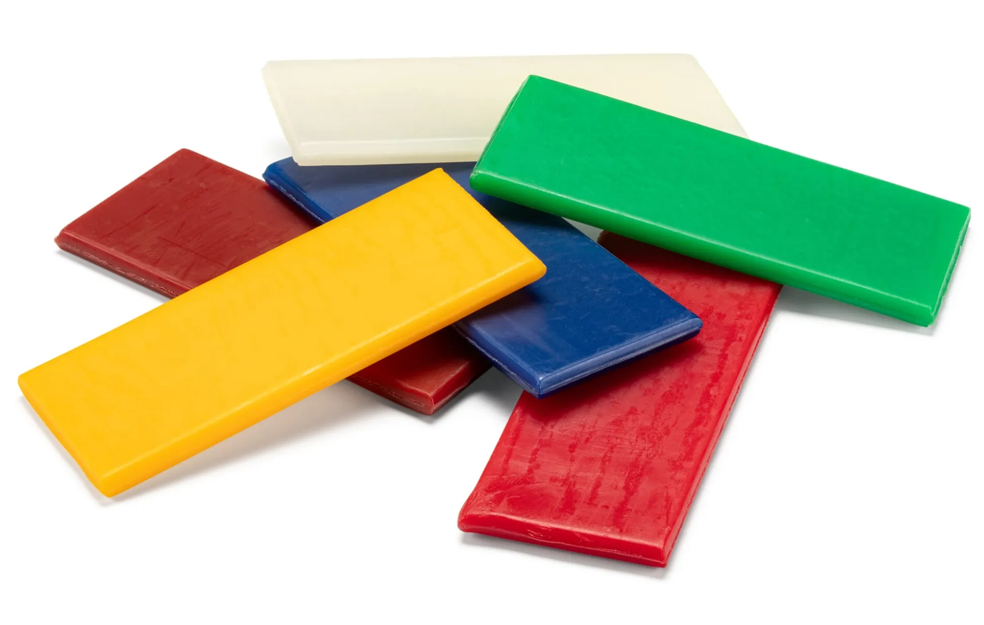 6 Wachstafeln à 4 × 10 cm in den Farben Elfenbein, Karminrot, Goldgelb, Grün, Blau, Rotbraun.