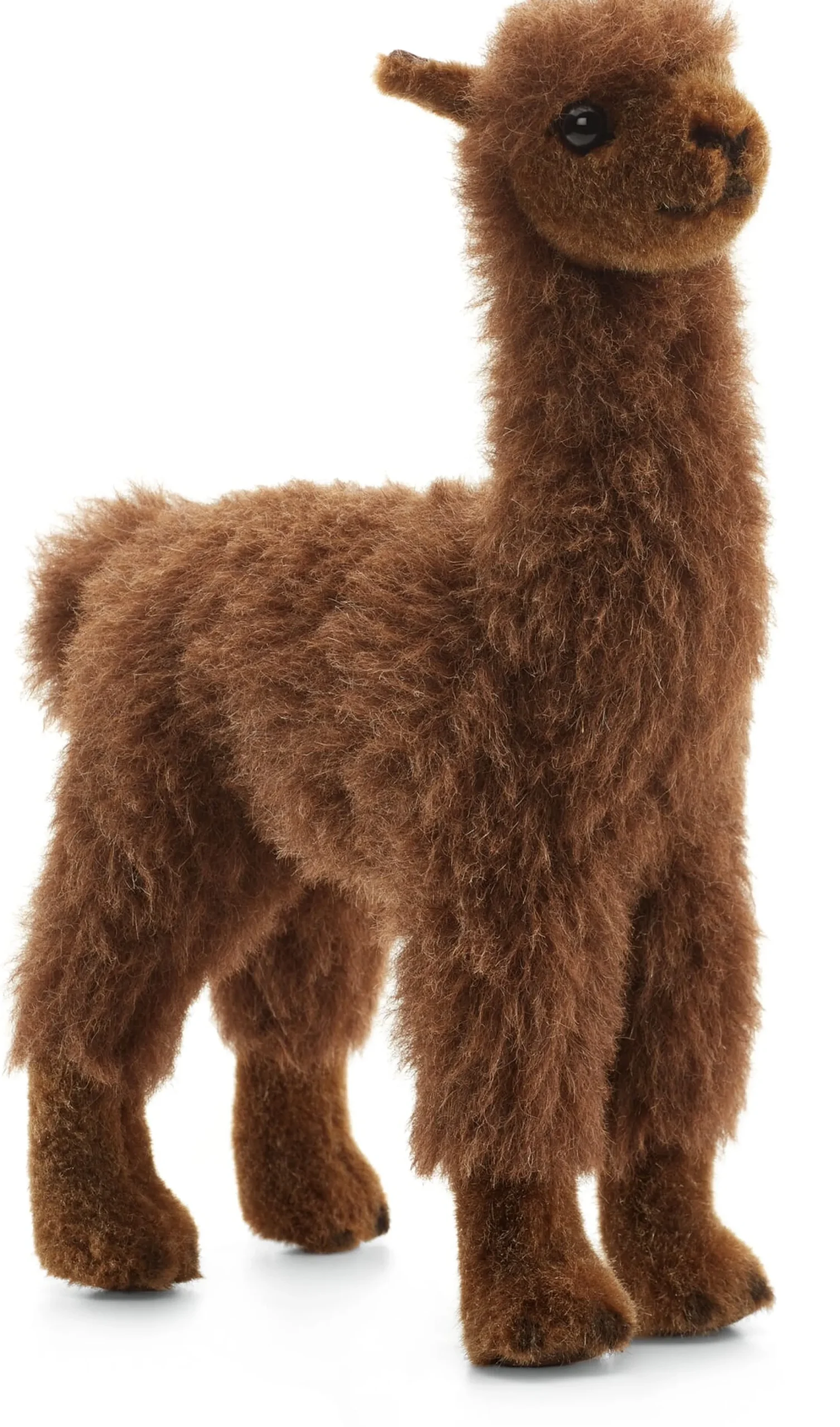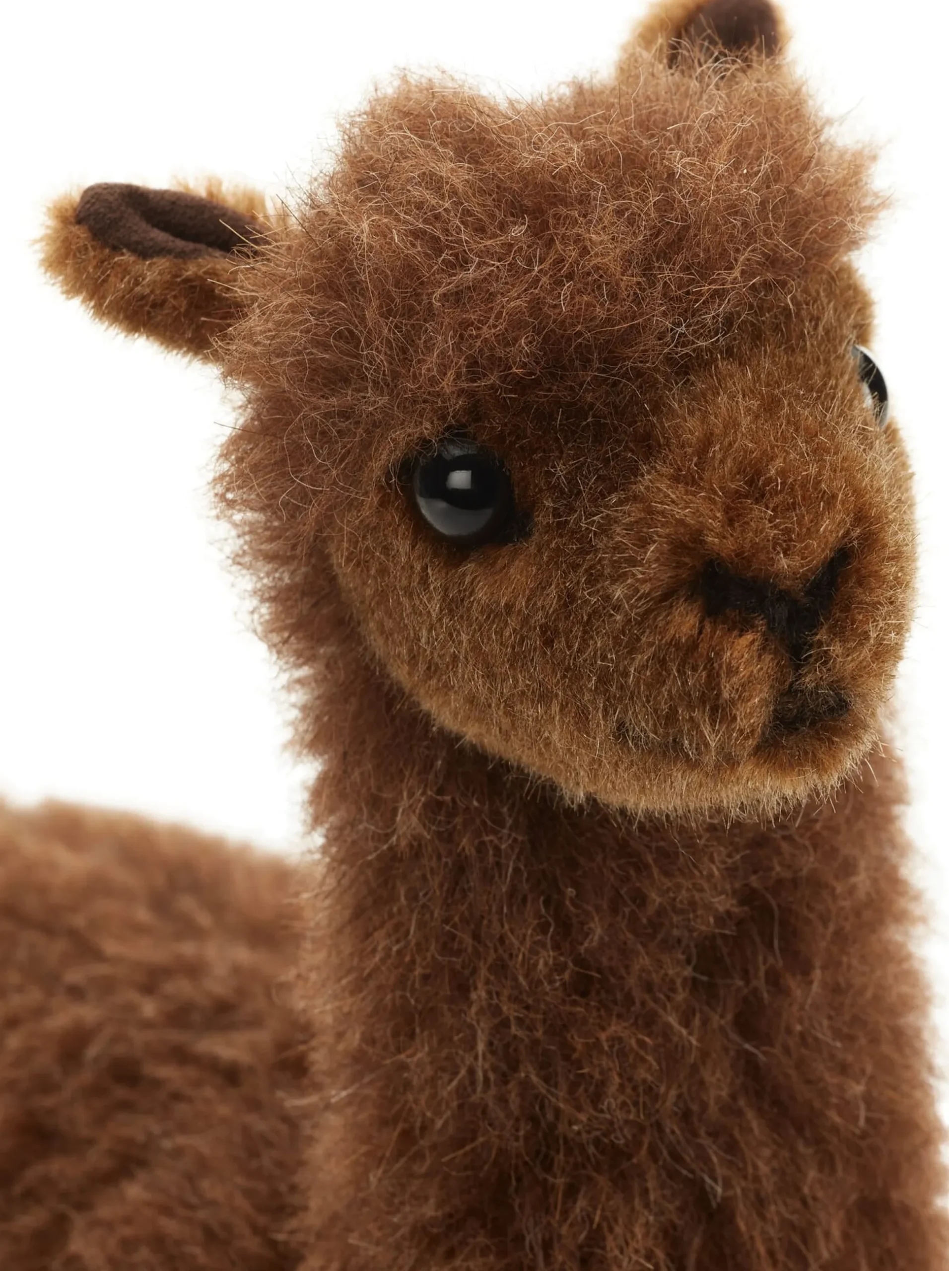 Fell Alpakahaar, Gesicht und Füße Webplüsch. Hergestellt in Deutschland. Länge 27 cm, Breite 8 cm, Höhe 28 cm. Gewicht 130 g.