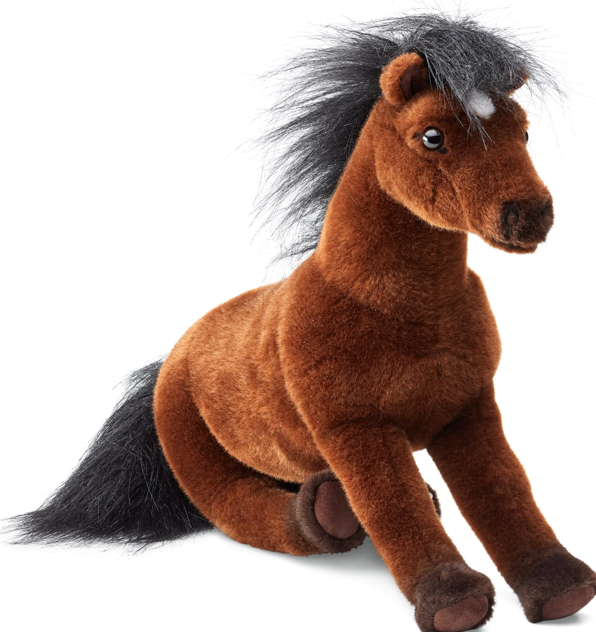 Fell Webplüsch, Mähne Langhaarwebplüsch. Hufe aus Kunstleder. Hergestellt in Deutschland. Länge 38 cm, Breite 12 cm, Höhe 28 cm. Gewicht 410 g.