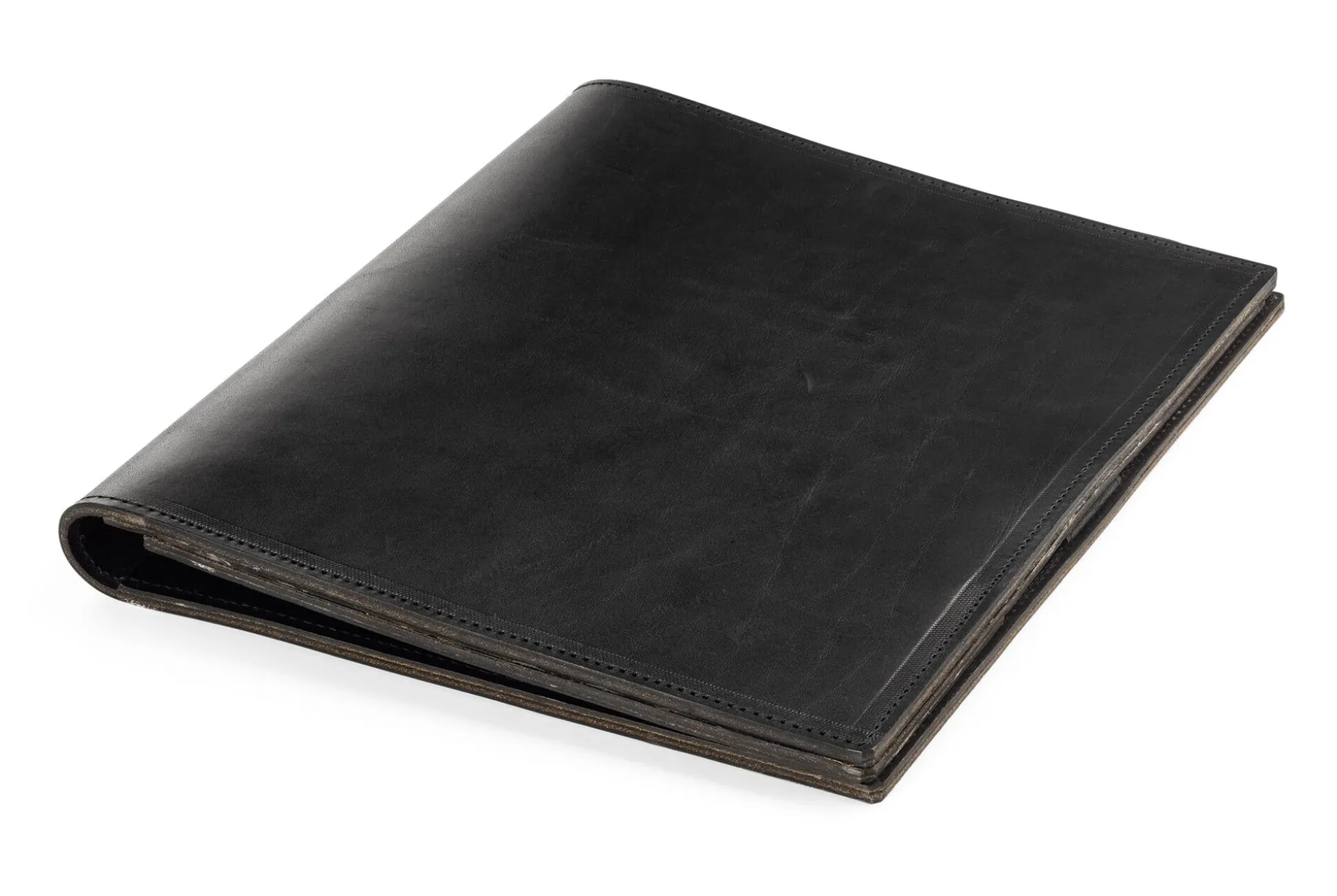 In Süddeutschland lassen wir diese Konferenzmappe aus vegetabil gegerbtem Rindhalsleder maßschneidern, die mehr ist als eine exquisite Schreibmappe: Auf der rechten Seite nimmt sie wahlweise den Manufactum Notizblock oder die ATOMA-Notizhefte im A4- bzw. A5-Format auf – letztere auch dann, wenn sie mit den überbreiten, registertauglichen Deckeln ausgestattet wurden. Auf der linken Seite lassen sich in zwei Spalten bis zu 20 bzw. 7 der Karteikarten im Hochformat mitführen; die unten geschlossenen Einsteckfächer sind so zugeschnitten, dass die Kopfzeilen der eingesteckten Karten jeweils lesbar sind. Lose Unterlagen finden, ebenfalls linksseitig, in zwei Einstecktaschen (eine davon zweiseitig geöffnet) Platz, weitere Karteikarten oder Visitenkarten in einem schmalen Einsteckfach am unteren Rand. Dem Mitführen eines Schreibgeräts dient die oben bzw. seitlich angebrachte Stiftschlaufe aus Leder.