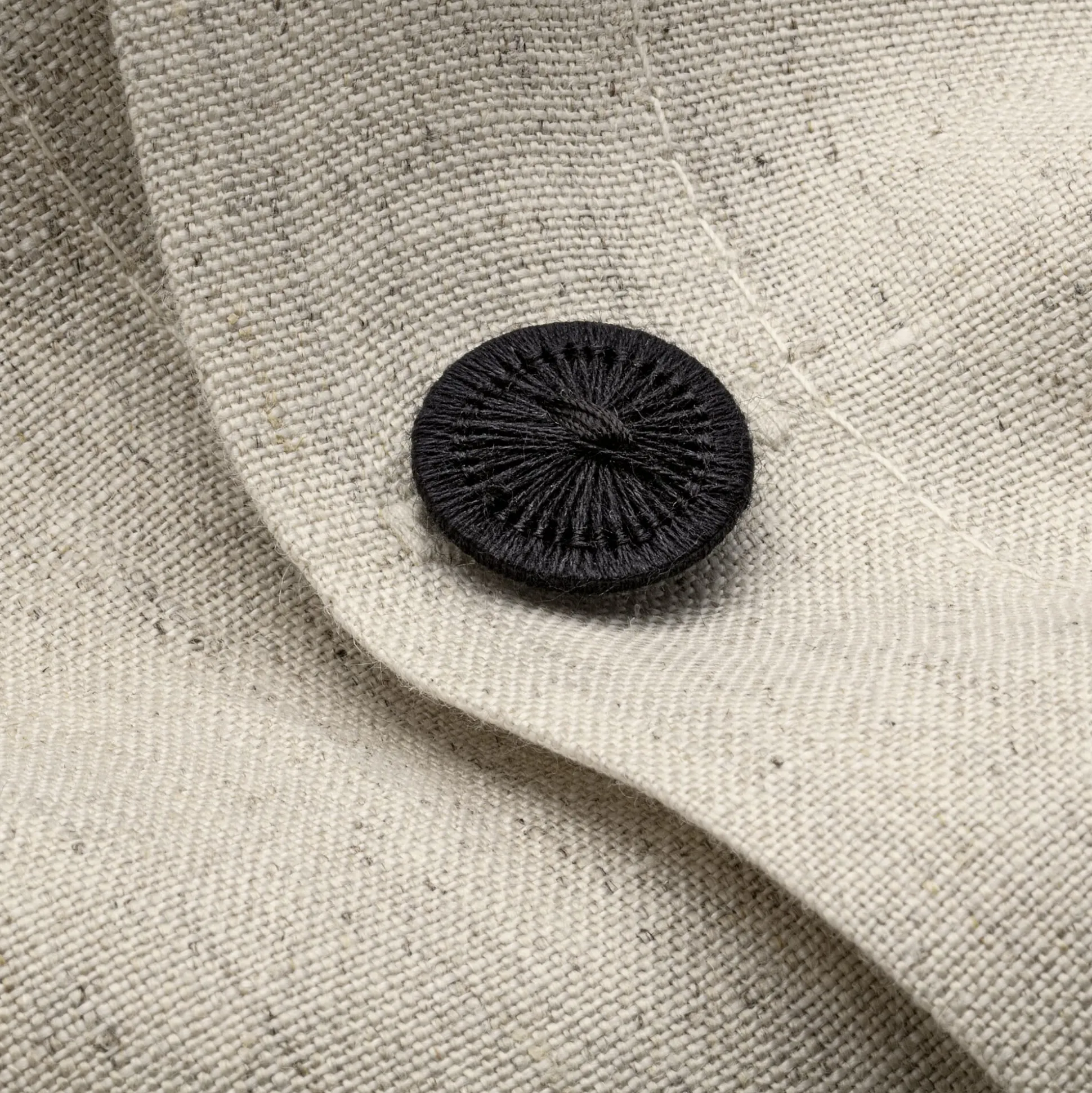 59% Hanf und 41% Leinen. Flächengewicht 178 g/qm. Die Bezüge sind vorgewaschen, der Resteinlauf beträgt 4%. Hergestellt in Österreich. Farbe Natur mit grau melierten Einwürfen und schwarzen Zwirnknöpfen.