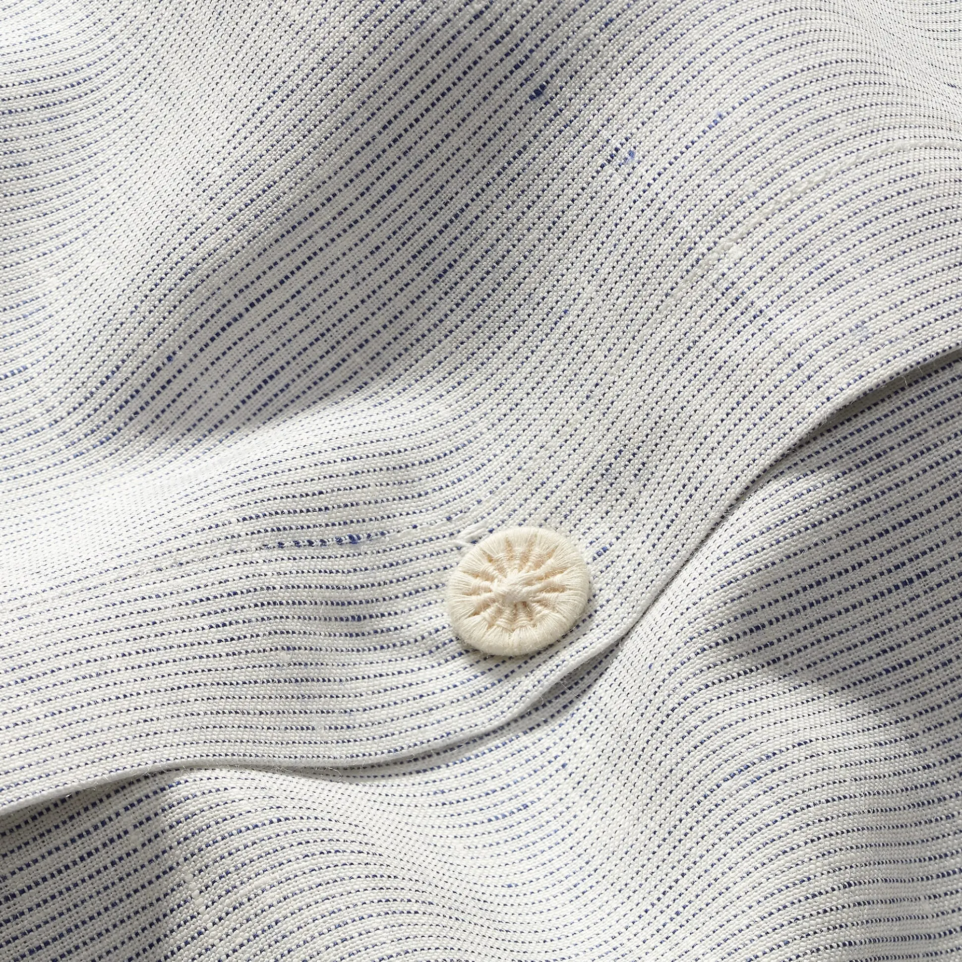 Blickt man von Weitem auf die Bettwäsche aus reinem Leinen, wirkt sie zunächst wie meliert. Erst bei näherem Hinsehen sind die feinen Streifen zu erkennen, die hier quer verlaufen und nicht wie häufig in Längsrichtung. Bei der hellen (weiß-blauen) Wäsche sind die Streifen blau, der Fond ist weiß. Bei den rot- bzw. blau-weißen Bezügen verlaufen weiße Streifen auf farbigem Fond. Die Lausitzer Weberei Hoffmann verarbeitet ausschließlich Leinen aus europäischem Langfaserflachs. Das hier verwendete Garn ist mit einer Stärke von Nm 26 recht fein und ergibt ein ebenso feines wie leichtes Gewebe mit einem weichen, leicht körnigen Griff.