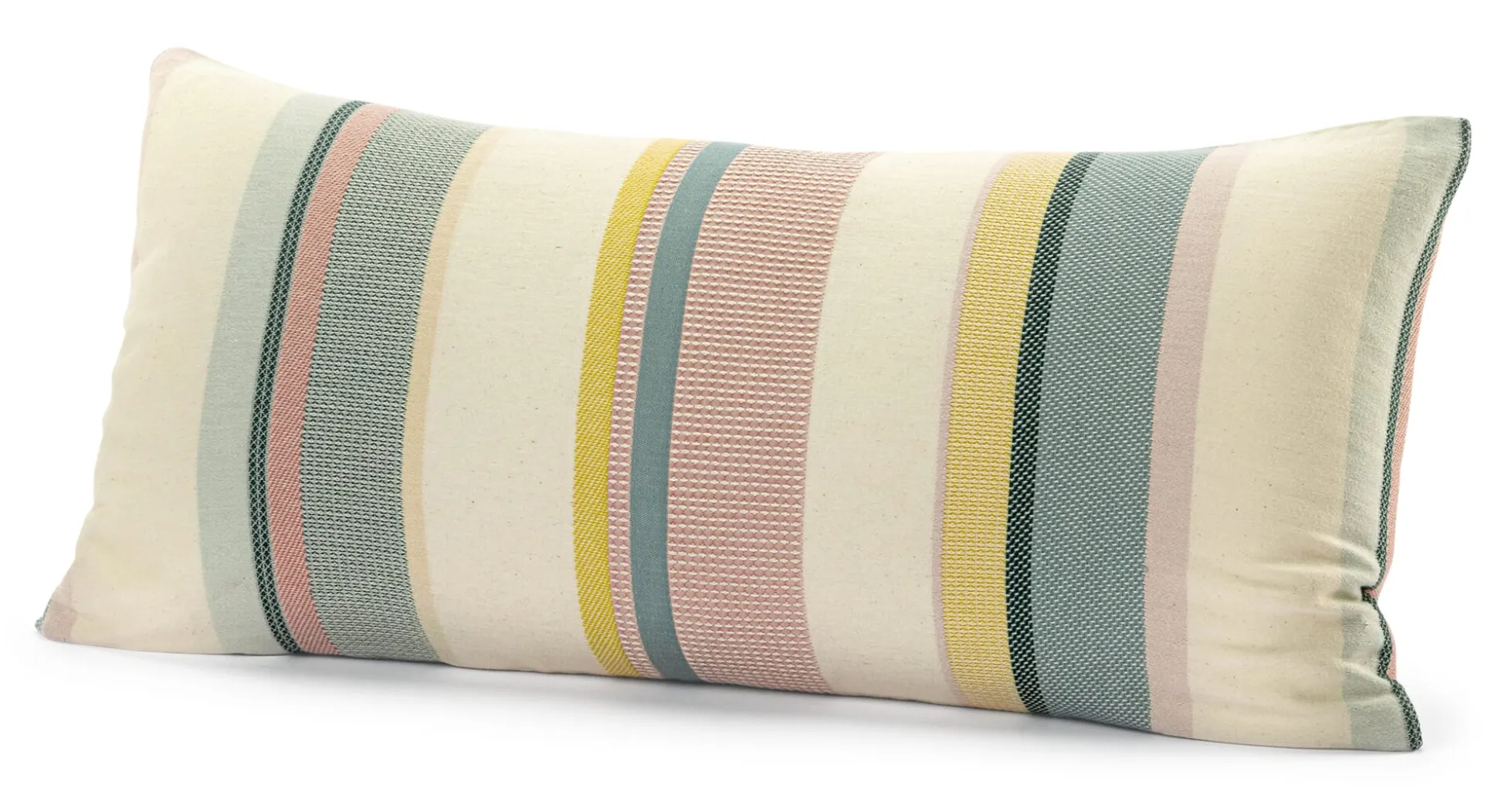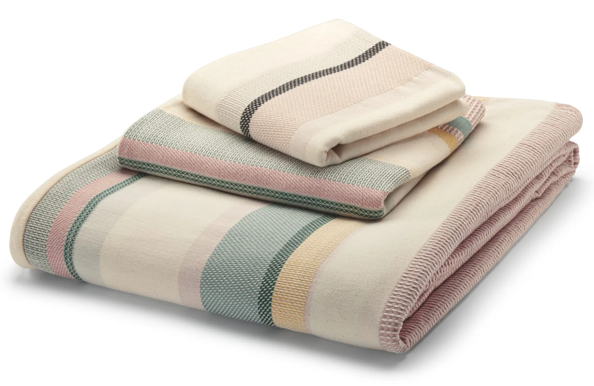 Diese Bettwäsche hat uns doppelt beeindruckt: Zum einen wird hier gewaschene Baumwolle verwendet, wodurch die Wäsche unglaublich weich und hautfreundlich ist. Sie besitzt mit 250 g/qm ein für Bettwäschen recht hohes Materialgewicht und ist deswegen besonders im Winter angenehm und wärmt zusätzlich. Zum anderen überraschen die Streifen nicht nur mit der gelungenen Farbkombination, sondern auch durch ihre Webart. Denn im Unterschied zum köperbindigen Fond mit seinem diagonalen Webbild sind die Streifen meist in anderen Bindungen, zum Beispiel in Waffel- oder Leinwandbindung, gewebt. Dies verleiht dem Gewebe eine strukturierte Oberfläche, dennoch liegt es dank der verwendeten feinen Baumwollgarne angenehm weich auf der Haut. Für die bunten Streifen werden – nicht selbstverständlich – gefärbte Garne eingesetzt. In der Kette kommt ein fester Zwirn (Garnstärke 51/2 Nm) zum Einsatz, im Schuss ein voluminöseres Einfachgarn der Stärke Nm 27. Letzteres verleiht dem Gewebe eine schmiegsame Oberfläche, dank der Köperbindung ist es strapazierbar und langlebig.