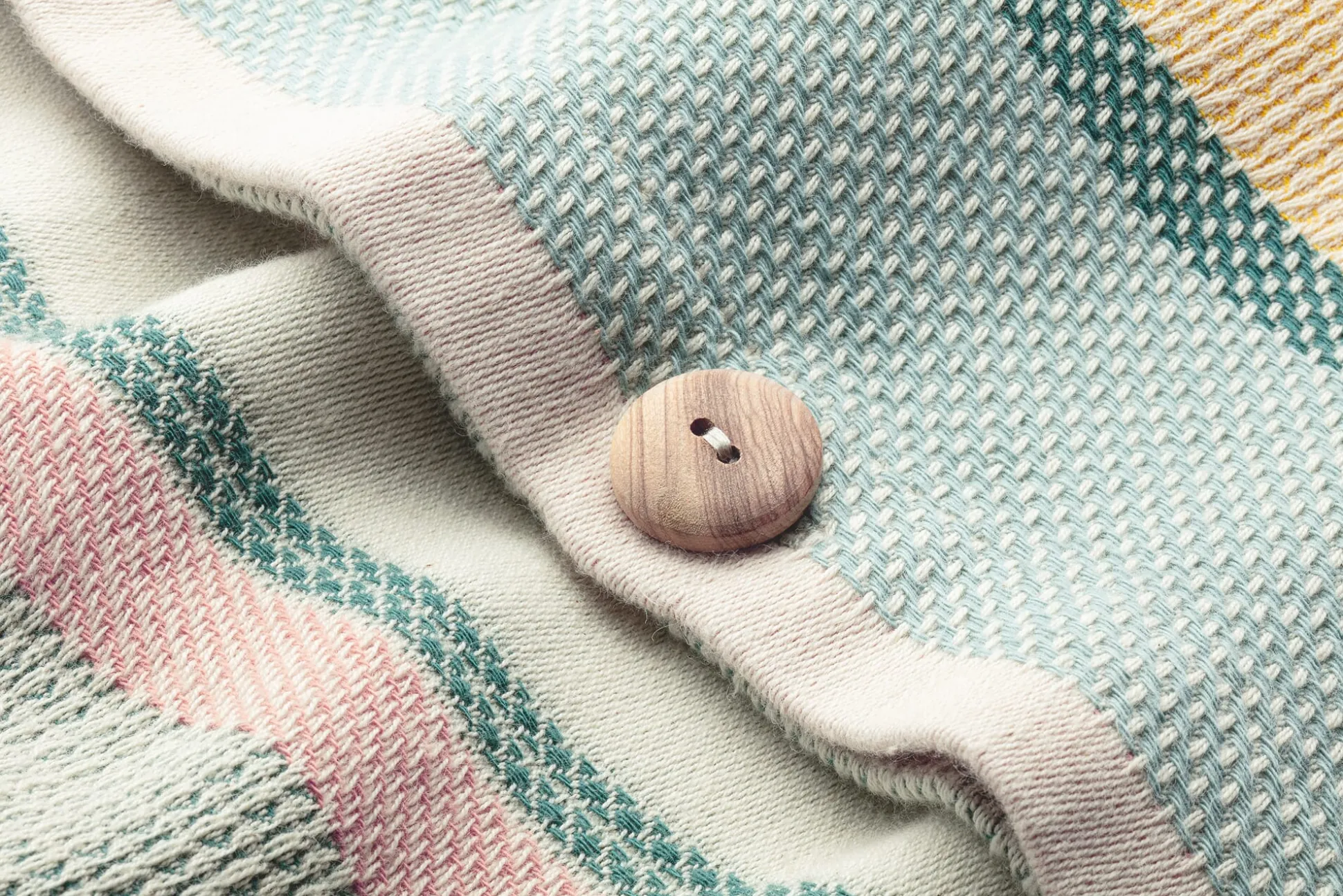 100% Baumwolle. Herkunft Portugal. Flächengewicht 250 g/qm. Bitte auf links waschen und keine Wäschestücke mit Reißverschlüssen oder Haken mit in die Trommel geben. Aufgrund der langen Flottungen können sich Fäden ziehen oder reißen und es kann zu Schlaufenbildung kommen. Einsprung 4%. Alle Bezüge sind mit Holzknöpfen versehen. Hergestellt in Portugal.