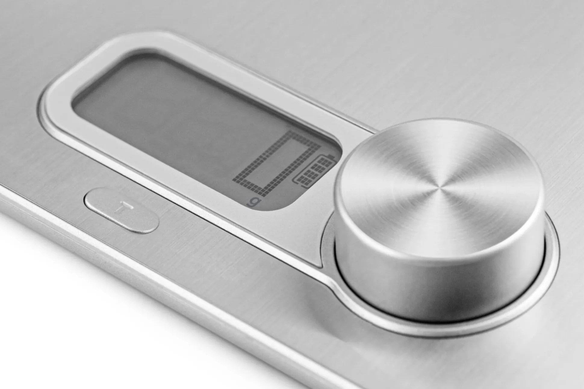 Digital-analog arbeitet die Küchenwaage FRIKTION. Analog betätigt man den Antrieb über den Drehknopf, der die kinetische Energie in elektrische Energie umwandelt und somit die Funktion der Waage mit ihrer digitalen Anzeige sicherstellt. Auf dieser befindet sich auch eine Kontrollanzeige der erzeugten Energie. Die Waage arbeitet dann 1 Minute ohne den Einsatz von Batterien. Die Wiegeskala reicht bis maximal 5 Kilogramm in Schritten von 1 Gramm. Die Wiegfläche der Waage ist aus gebürstetem Edelstahl gefertigt. Der kleine separate Knopf ist für die Tara-Funktion.