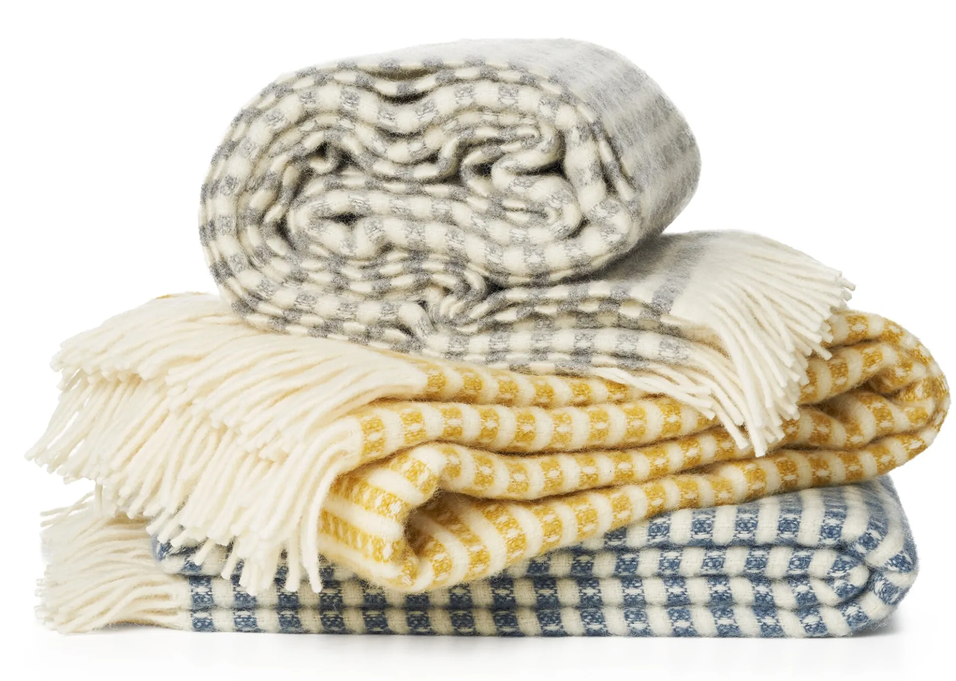 Leichte Decke aus 100 % Wolle aus der ersten Schur der jungen Schafe. Die Decke trägt ein klassisches Streifenmuster in zeitgenössischen Farben.