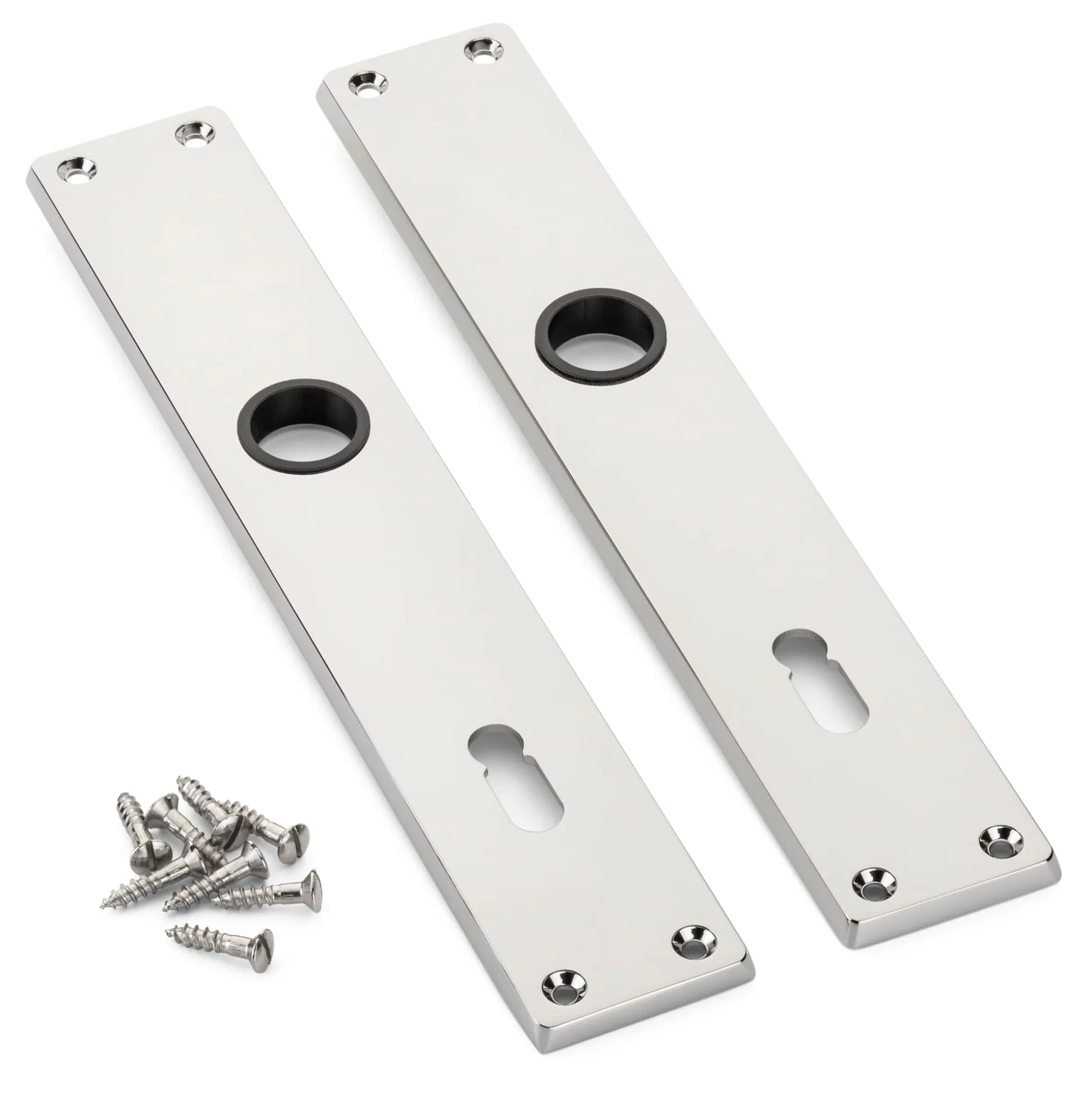 Für Buntbartschlösser. Zinkdruckguss, vernickelt und poliert (Materialstärke 1,7 mm). 20 × 3,5 cm. Gewicht (einzeln) 80 g. Lieferung mit den passenden Schrauben.