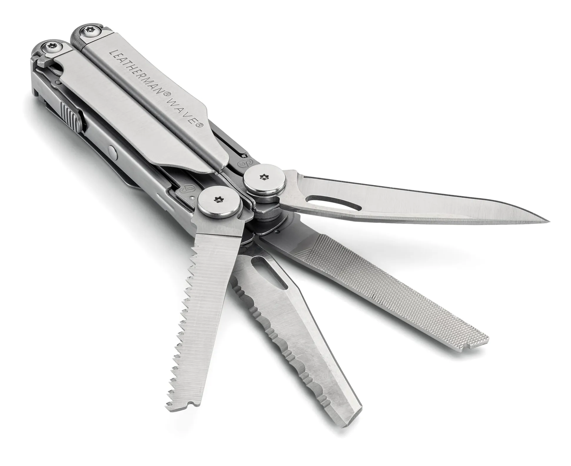 Ein Klassiker unter den Leatherman®, in optimierter Form, denn das Wave+ kommt mit auswechselbaren Drahtschneidern. Viele Werkzeuge sind von außen zugänglich, sodass das zugeklappte Tool wie ein Taschenmesser funktioniert: Eine Säge, ein Wellenschliffmesser, eine Feile für Holz oder Metall, eine diamantbeschichtete Feile und ein Messer lassen sich ausklappen. Das geöffnete Werkzeug hält eine Kombizange (Spitz- und normale Zange), eine Crimpzange, eine Schere mit Federbetätigung, einen mittleren Schraubendreher, einen großen und kleinen Bithalter, einen Draht- und einen Hartdrahtschneider, eine Abisolierklinge, einen Dosen- und Flaschenöffner sowie ein Lineal vor. Mitgelieferte Bits: eine Uhrmacher-Schraubendreher sowie einen 1/2″- und einen 3/16″-Kreuzschlitz-Schraubendreher. Mit Anhängeöse.
