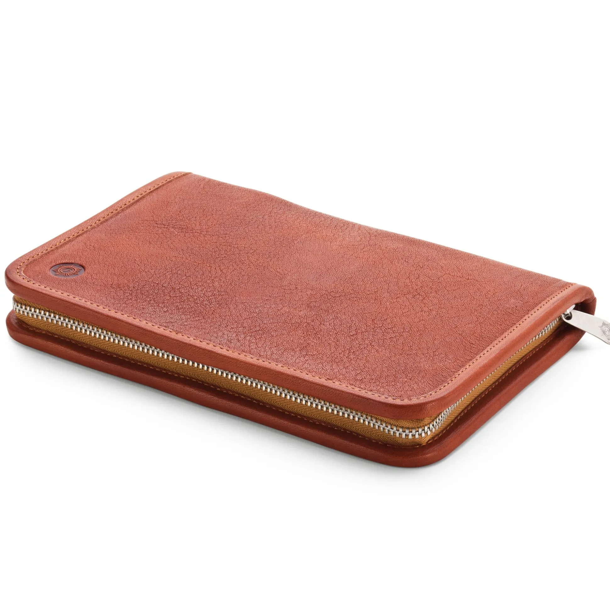 Rindleder grubengegerbt (Herkunft Deutschland). Ungefärbt bzw. schwarz im Fass durchgefärbt. Reißverschluss Messing vernickelt. Hergestellt in Ungarn. L 20,5 × B 14 × H 2,5 cm. Gewicht 380 g.