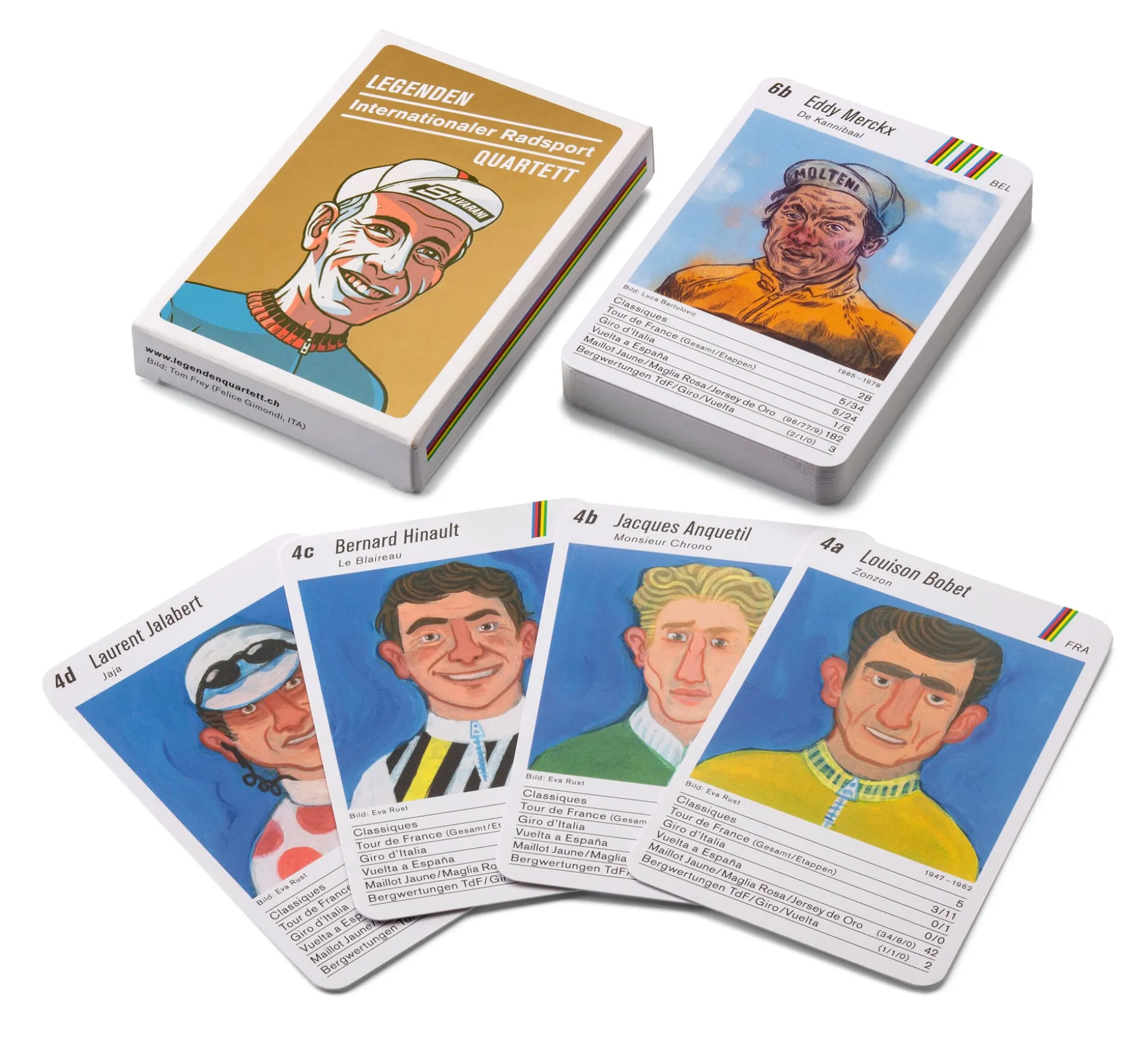Was geschieht, wenn die Topfahrer des Radsports aufeinandertreffen – „Monsieur Chrono“ Jacques Anquetil ist in Bestform und kann nicht geschlagen werden? Nun ja, er muss sich erst einmal mit Eddie „Der Kannibale“ Merckx messen. Dieser mag achtmal häufiger das Leadertrikot getragen haben, aber in den Bergwertungen jagt ihm doch Charly Gaul davon. Tourensieg für die (Quartett-)Spielenden, welche die Kennzahlen kennen. Das Legendenquartett Radsport führt auf, wie viele Siege der Fahrer in den Classiques (klassischen und halbklassischen Eintagesrennen) einfahren und wie oft er den Weltmeistertitel im Straßenrennen erringen konnte. Darüber hinaus dürfen natürlich die Grands Tours nicht fehlen: Entscheidend sind hier die Anzahl der Gesamt- und der Etappensiege bei der Tour de France, beim Giro d’Italia und bei der Vuelta a España, außerdem die Anzahl der jeweiligen Leadertrikots sowie nicht zuletzt die Anzahl der gewonnenen Bergwertungen. Und wie im echten Leben, so sorgt auch in diesem Radsport-Quartett jedes neue Aufeinandertreffen der Legenden für Spannung.