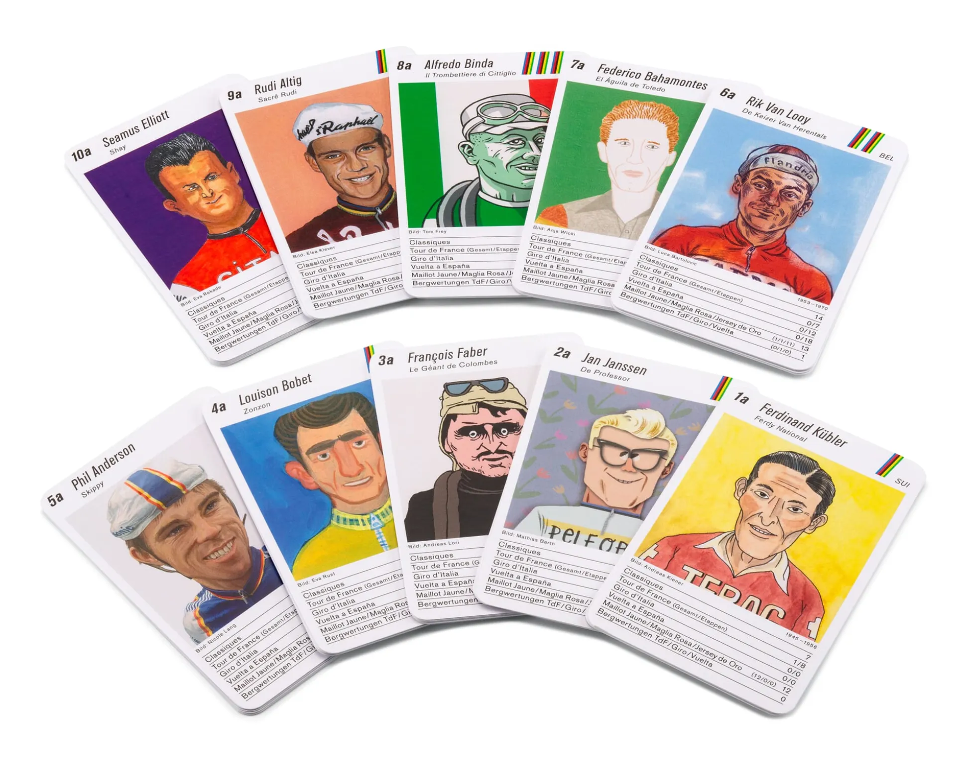 So herausragend die Leistungen der jeweiligen Sportlegenden, so ungewöhnlich sind auch ihre Konterfeis. Namhafte Künstler*innen aus der Schweiz und aus Deutschland zeichnen für die Illustrationen des Legenden-Quartetts verantwortlich. Zu jeweils zehn Teams à vier Mannschaftsmitglieder gruppiert, stellen die Karten nicht nur die Eigenheiten der Sportler*innen heraus. Vielmehr verdeutlichen sie in besonderer Weise, welch vielfältige Ansätze moderne Kunst zu bieten hat. Will meinen: Man kann mit den Karten nicht nur spielen. Man kann sie auch einfach genussvoll betrachten.