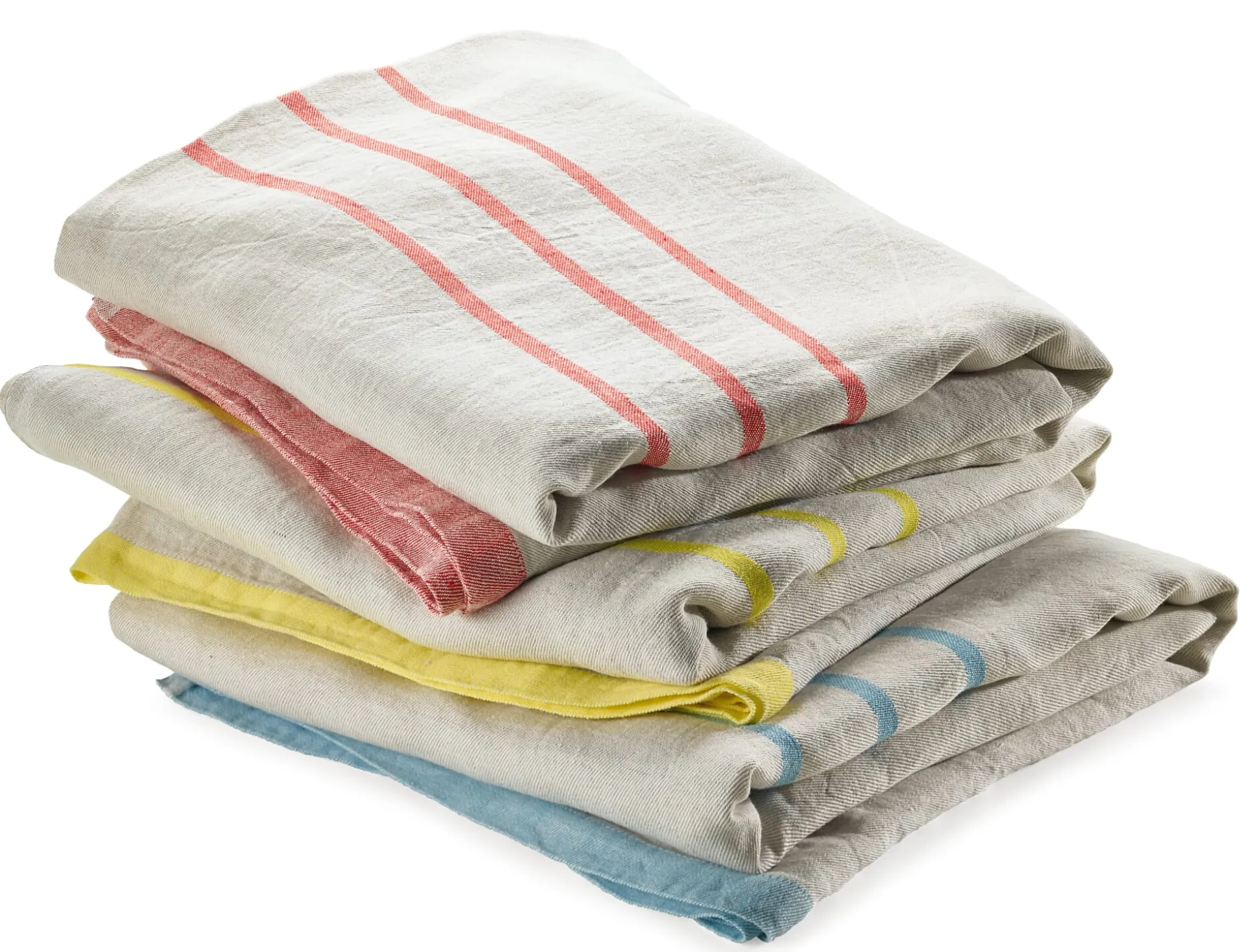 Die finnische Leinenweberei Lapuan Kankurit webt den Fond des Tuchs aus kräftigem, ungefärbtem Leinen, die Streifen aus gefärbtem Leinengarn. Mit einem Gesamtgewicht von etwa 780 g ist es nicht zu schwer fürs Gepäck, das Gewebe hingegen ist kräftig genug, um allen Anforderungen unterwegs standzuhalten. Leinen ist vor allem im Sommer angenehm, da es rasch viel Feuchtigkeit aufnehmen und ebenso schnell wieder abgeben kann – es fühlt sich angenehm kühlend an, ist zudem antistatisch und aufgrund der glatten Faseroberfläche pollen-, staub- und schmutzabweisend. Das Tuch ist sanforisiert und hat daher einen weichen, schmiegsamen Griff.